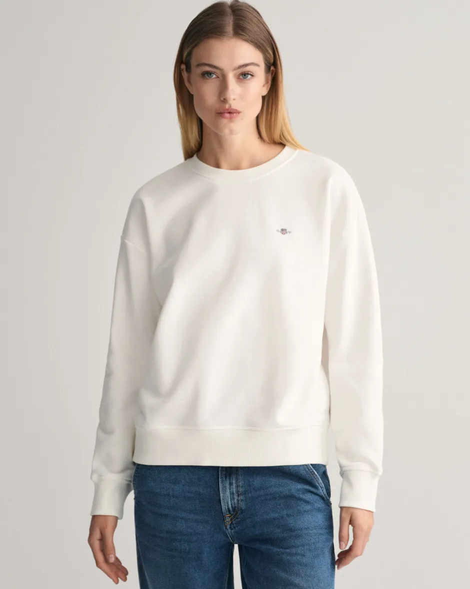Gant collegepaita pyöreällä pääntiellä ja rennolla istuvuudella. Jos suosit tyköistuvampaa mallia, kannattaa valita pienempi koko. Rinnassa kirjailtu Gant -logo.