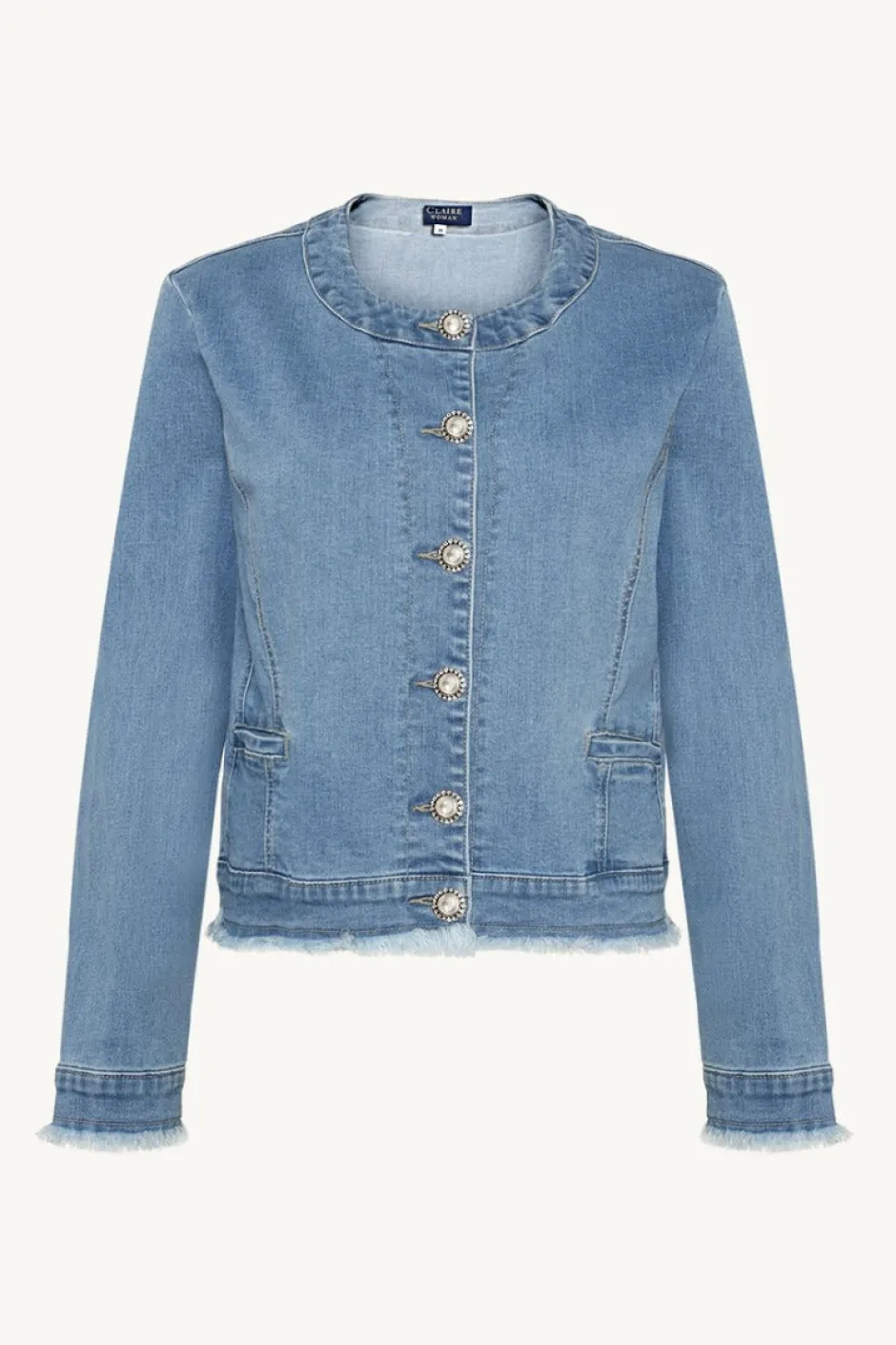 Denimtakki pyöreällä pääntiellä ja etutaskuilla. Takissa on kauniit tekojalokivinapit ja koristeelliset hapsut hihoissa ja helmassa.