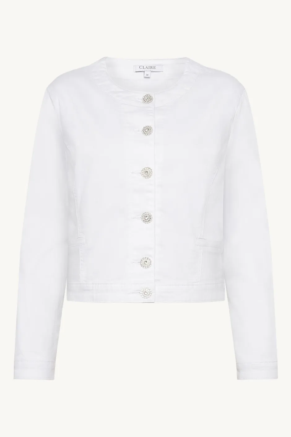 Upea farkkutakki timanttinapeilla. Kaunis leikkaus ja avoin pääntie sopivat monelle keholle ja elastaanin ansiosta farkku joustaa ja luo lisää käyttömukavuutta.