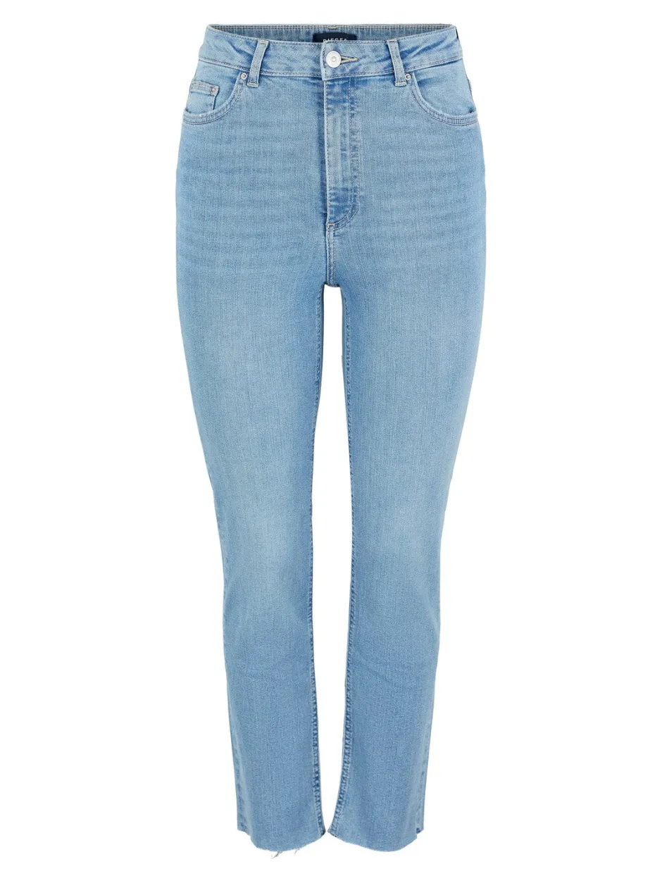 Naisten korkeavyötäröiset farkut, vaalea pesu. Viisitaskumalli. Edessä vetoketju ja metallinen nappi, viisi vyölenkkiä.