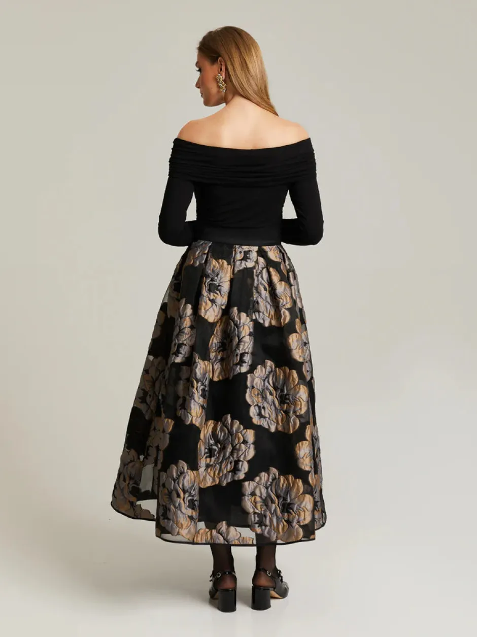 Pohjemittainen hame, jossa näyttävä helma ja laskostukset. Valmistettu ylellisestä ruusukuosisesta cloque-kankaasta. Piilovetoketju sivussa. Hameessa on vuori.