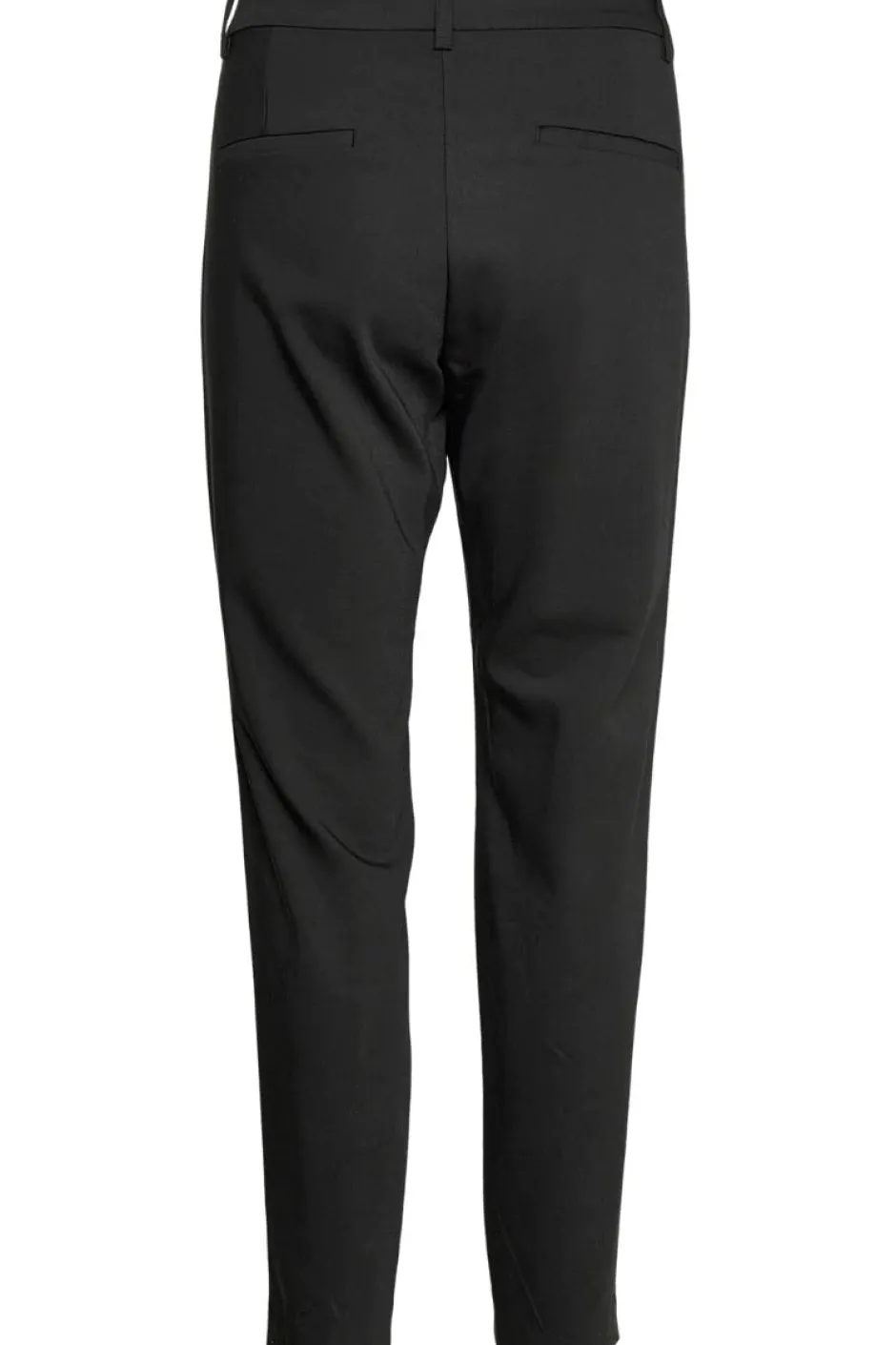 Naisten kapealinjaiset joustavat housut. Lahkeensuissa pienet halkiot. Edessä vetoketjulliset taskut.