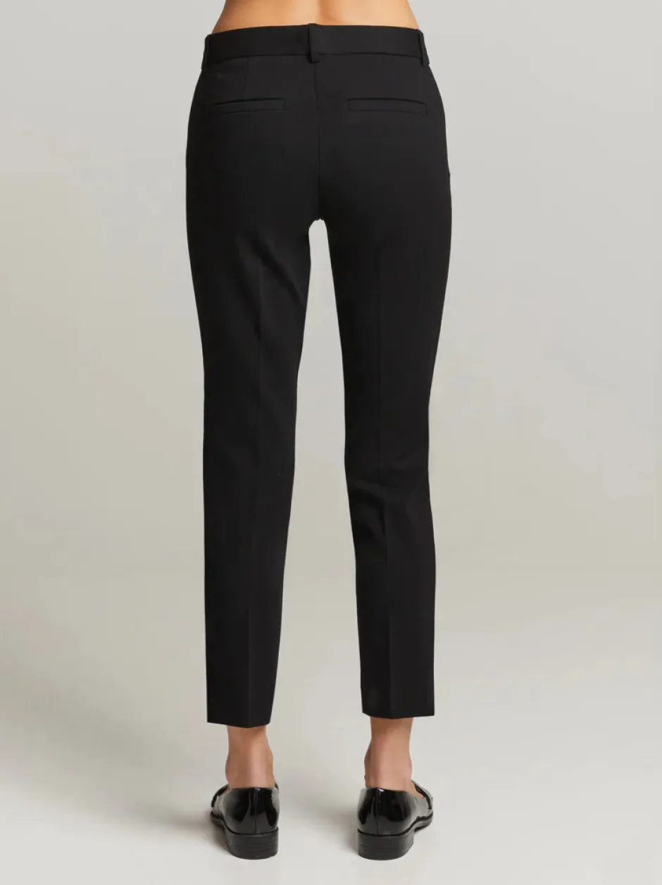 Klassiset nilkkapituiset, kapealinjaiset mustat housut paksusta ja joustavasta, miellyttävän tuntuisesta jersey-kankaasta. Keskikorkea vyötärö, vyölenkit ja sivutaskut. Vetoketju sekä piilotettu hakas- ja nappikiinnitys edessä.
