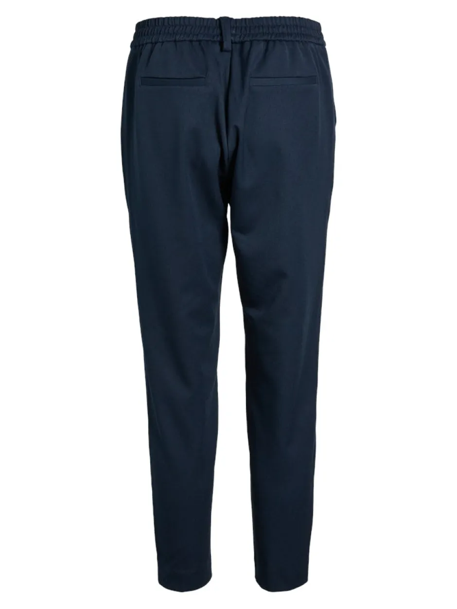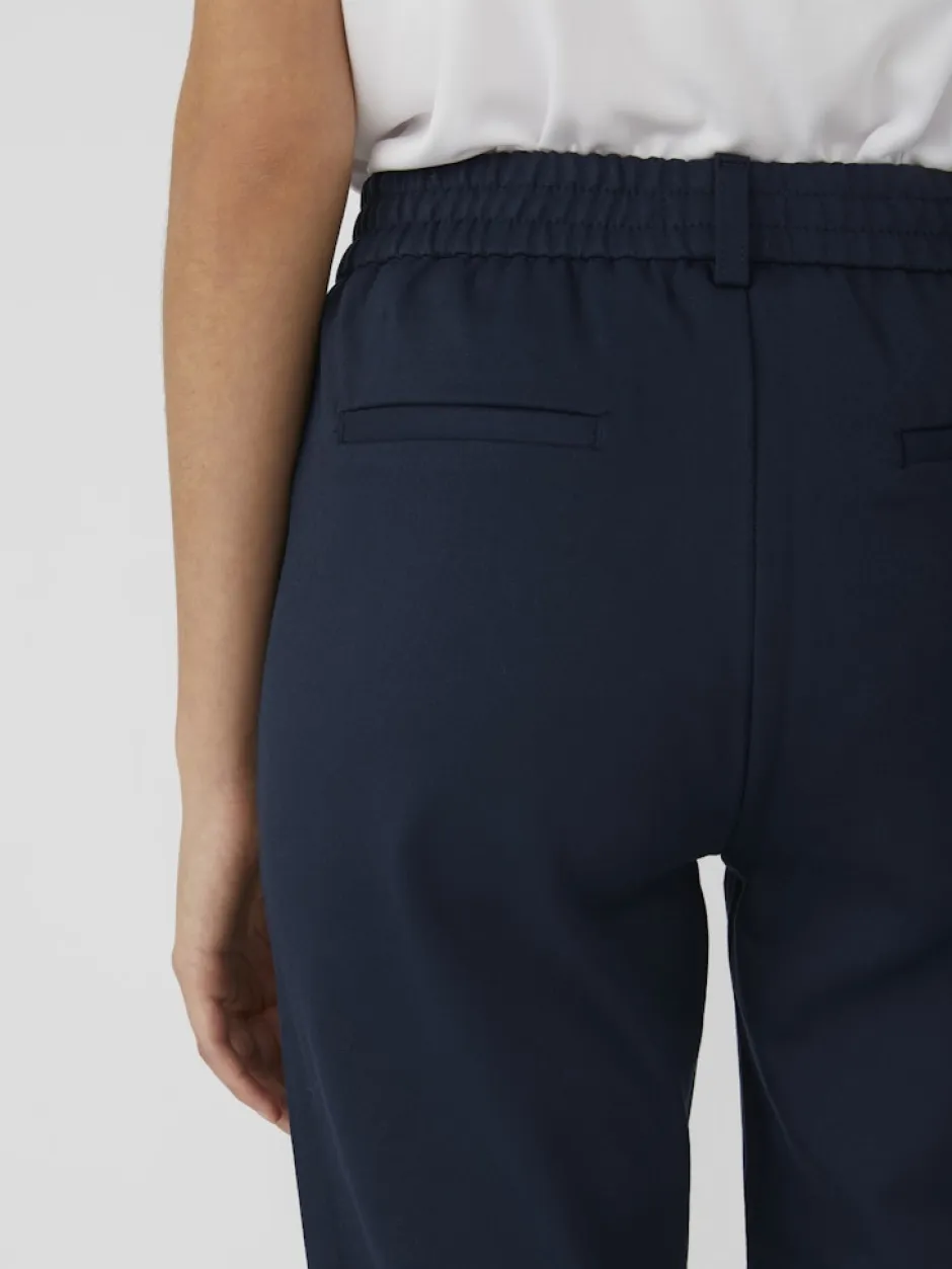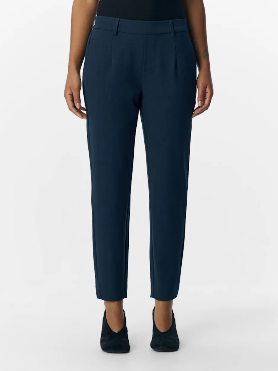 Objectin naisten suorat housut miellyttävää ja joustavaa materiaalia. Kapeahkon malliset housut, joissa resori takana vyötäröllä. Edessä kaksi taskua, takana piilotaskut. Vyölenkit vyötäröllä.