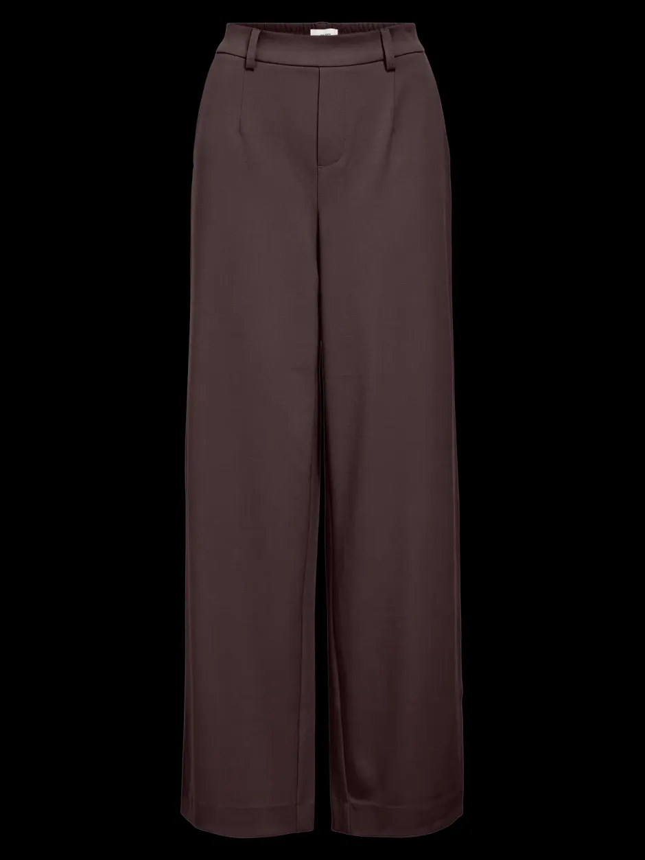 Naisten leveälahkeiset, nilkkapituiset housut, normaali vyötärön korkeus, vyötäröllä vyölenkit. Edessä laskokset..