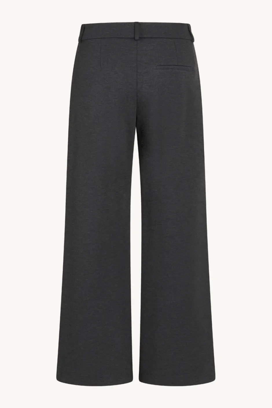 Klassiset housut, jossa on leveät lahkeet ja viistot etutaskut. Mallissa on vyölenkit ja valetasku takana.