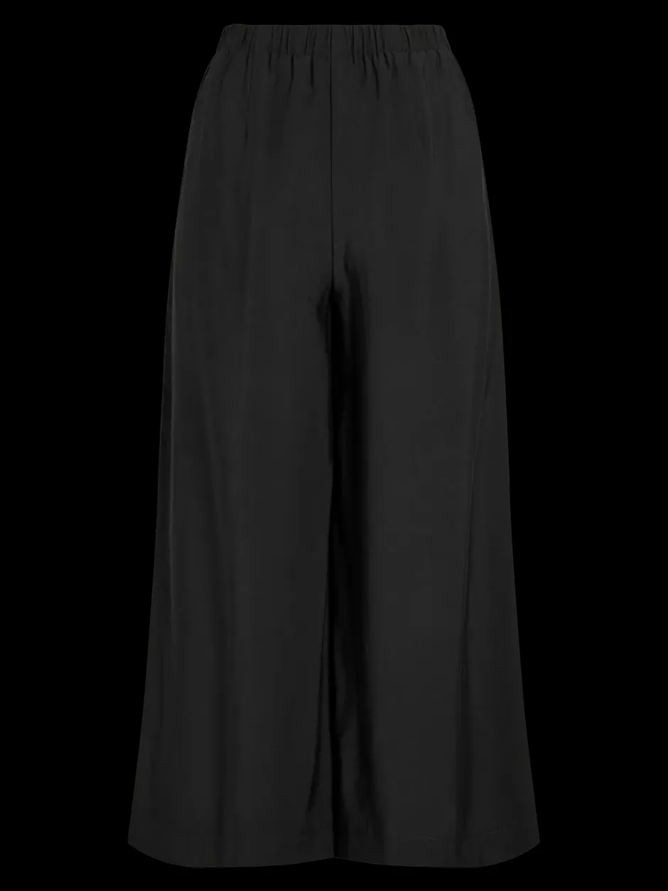 Leveälahkeiset culottes-malliset housut, joissa on korkea vyötärö sekä vetoketjukiinnitys. Housuissa on rento, mutta tyylikäs ilme. Housujen kevyt materiaali sisältää 93% viskoosia ja 7% polyesteriä, joka tuntuu miellyttävältä ja kestää hyvin käyttöä.