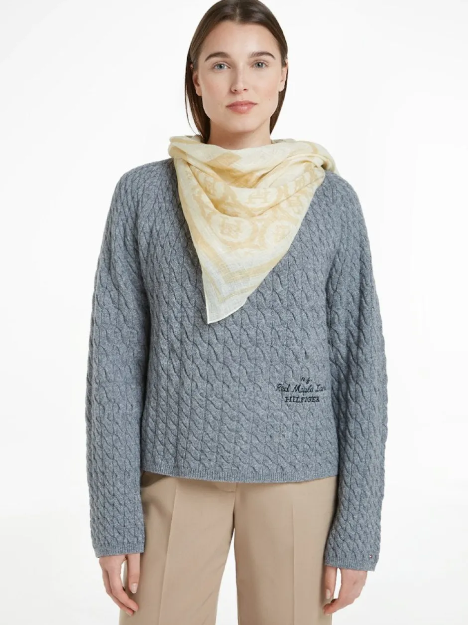 Tämä monikäyttöinen neliöhuivi täydentää sekä tyylikkäitä, että rentoja asuja puhtaasta pellavakankaasta valmistetulla hienostuneella TH-monogrammikuviolla. 90×90