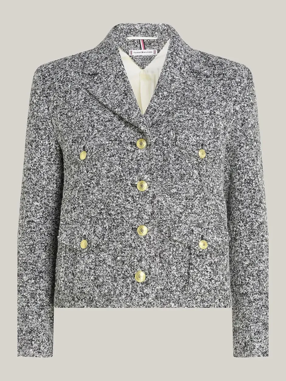 Täysin vuorattu jakku, joka on viimeistelty kullanvärisillä napeilla.
