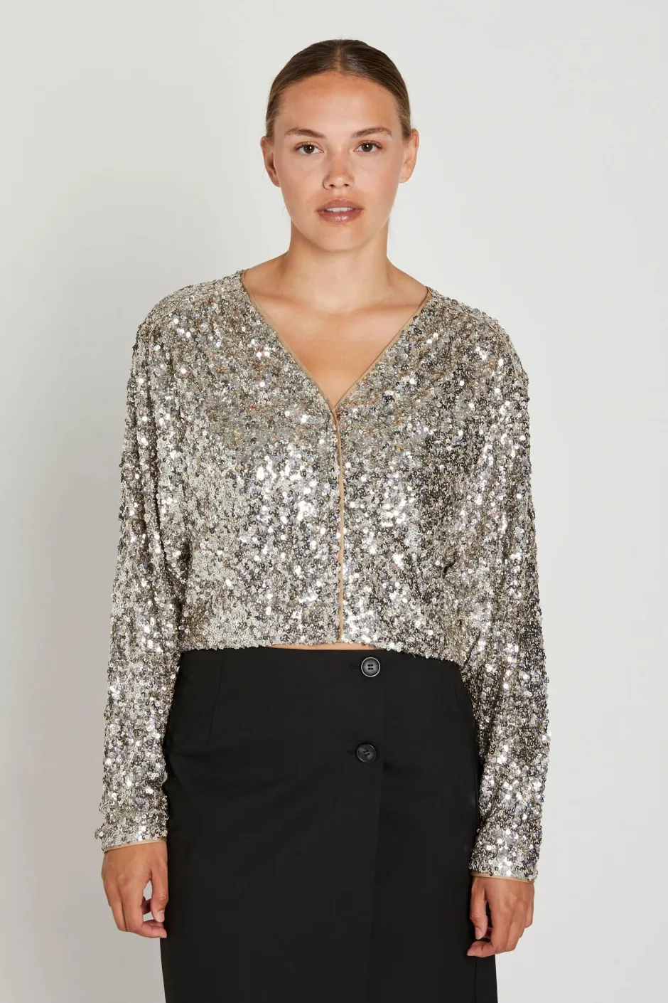 Tämä jakku tuo juhlatunnelmaa paljettipinnallaan ja lyhyellä leikkauksellaan. Toimii täydellisesti sekä iltakäyttöön että arkeen, kun haluat lisätä asuusi säihkettä.