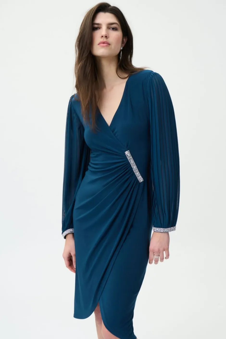 Ribkoff naisten näyttävä juhlallinen kietaisumekko upeilla yksityiskohdilla. Hihansuissa sekä vyötäröllä kauniit kristallisomisteet. Leveät pliseeratut hihat. Joustavan ja miellyttävän materiaalin ansiosta todella mukava päällä.