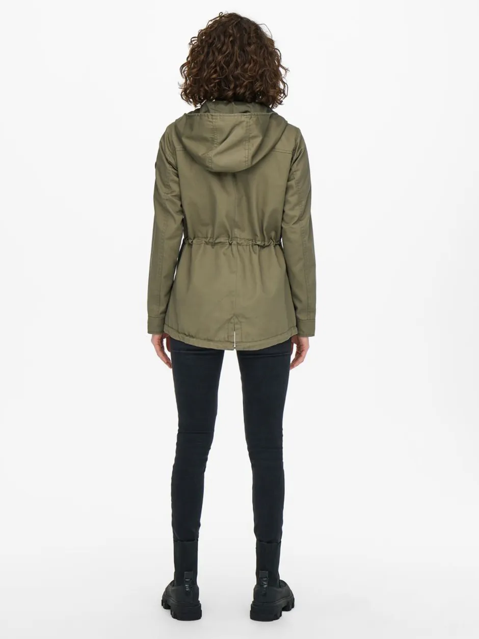 Onlyn kevyt parkatakki toimii välikausitakkina niin keväällä kuin syksyllä. Lyhytmallinen kevättakki, jossa on huppu ja hieman korotettu kaulus. Vetoketjukiinnitys ja nappilista, joka sujaa tuulelta. Vetoketjullinen rintatasku ja lpälälliset etutaskut. Vyötäröllä kiristysnauha. Takaa helma pyöristetty.