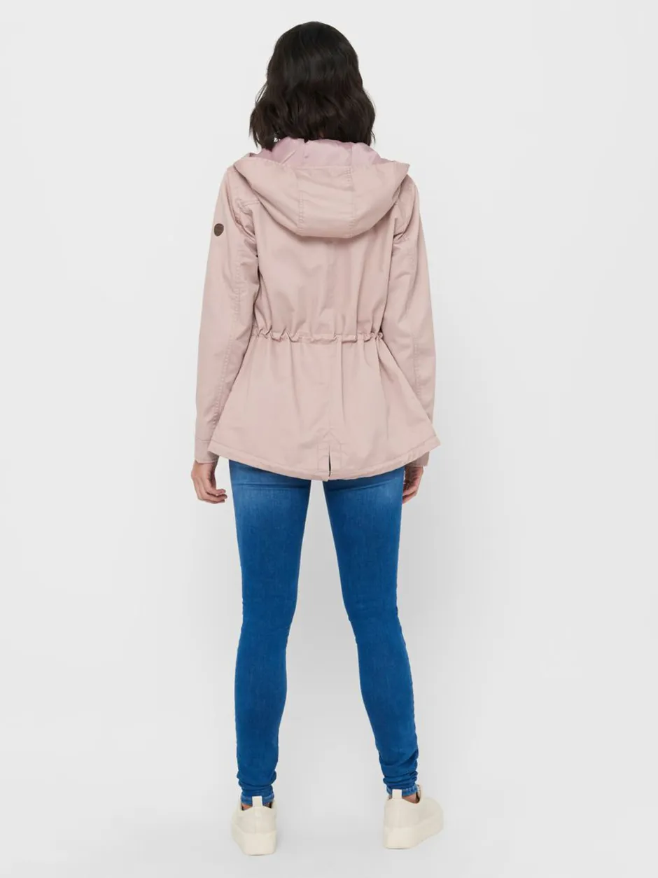Onlyn kevyt parkatakki toimii välikausitakkina niin keväällä kuin syksyllä. Lyhytmallinen kevättakki, jossa on huppu ja hieman korotettu kaulus. Vetoketjukiinnitys ja nappilista, joka sujaa tuulelta. Vetoketjullinen rintatasku ja lpälälliset etutaskut. Vyötäröllä kiristysnauha. Takaa helma pyöristetty.