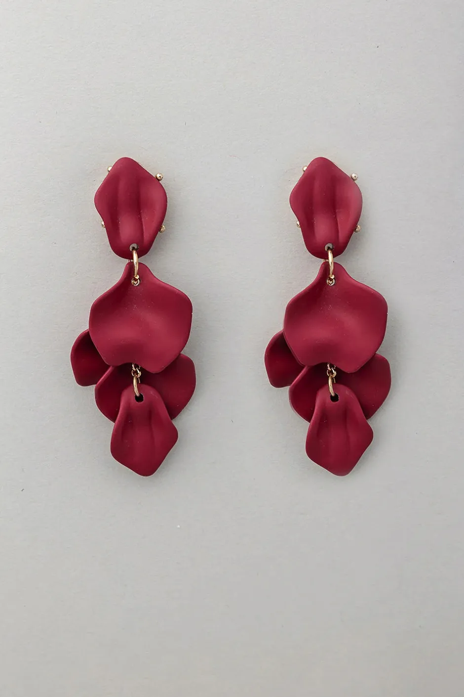 Bow 19 Pearl Leaf -korvakorut viininpunaisena: lehtimäiset, roikkuvat korvakorut helmiäismäisellä pinnalla. Kevyt ja näyttävä malli sopii arkeen ja juhlaan; pituus noin 6,5–7,5 cm.