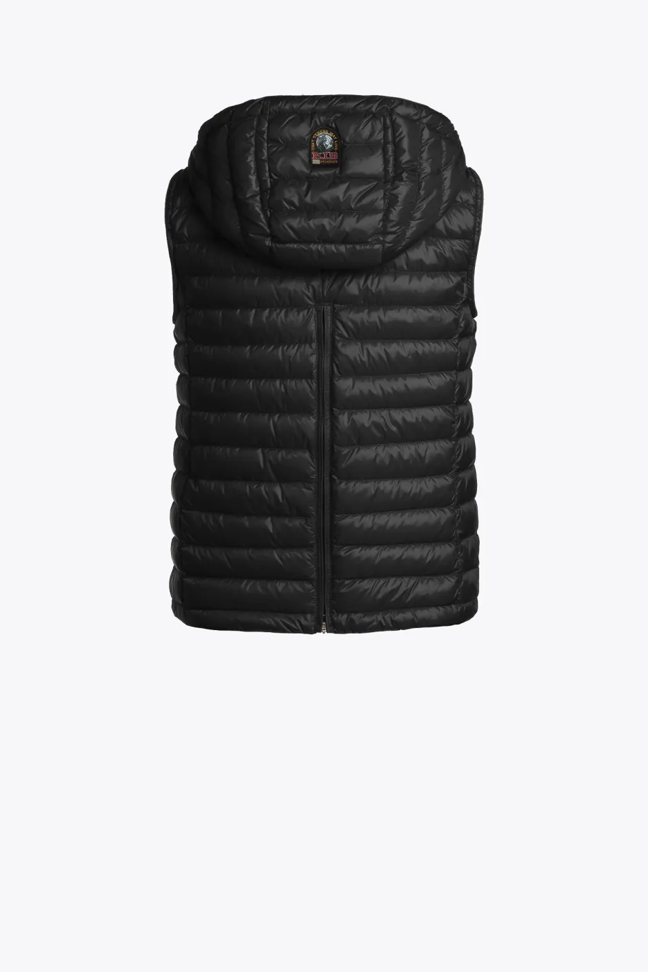 Naisten kevyt, beigenvärinen, hupullinen untuvaliivi. Naisellinen leikkaus, kangas kevyttä vettähylkivää nailonia, täyte ankanuntuvaa. Edessä vetoketjulliset taskut. Hupun reunassa kiristysnyöri, takana huppua muotoileva kiritysnyöri. Takana selässä vetoketjulla aukeava laskos, laskoksen pohja luonnonvalkoinen.