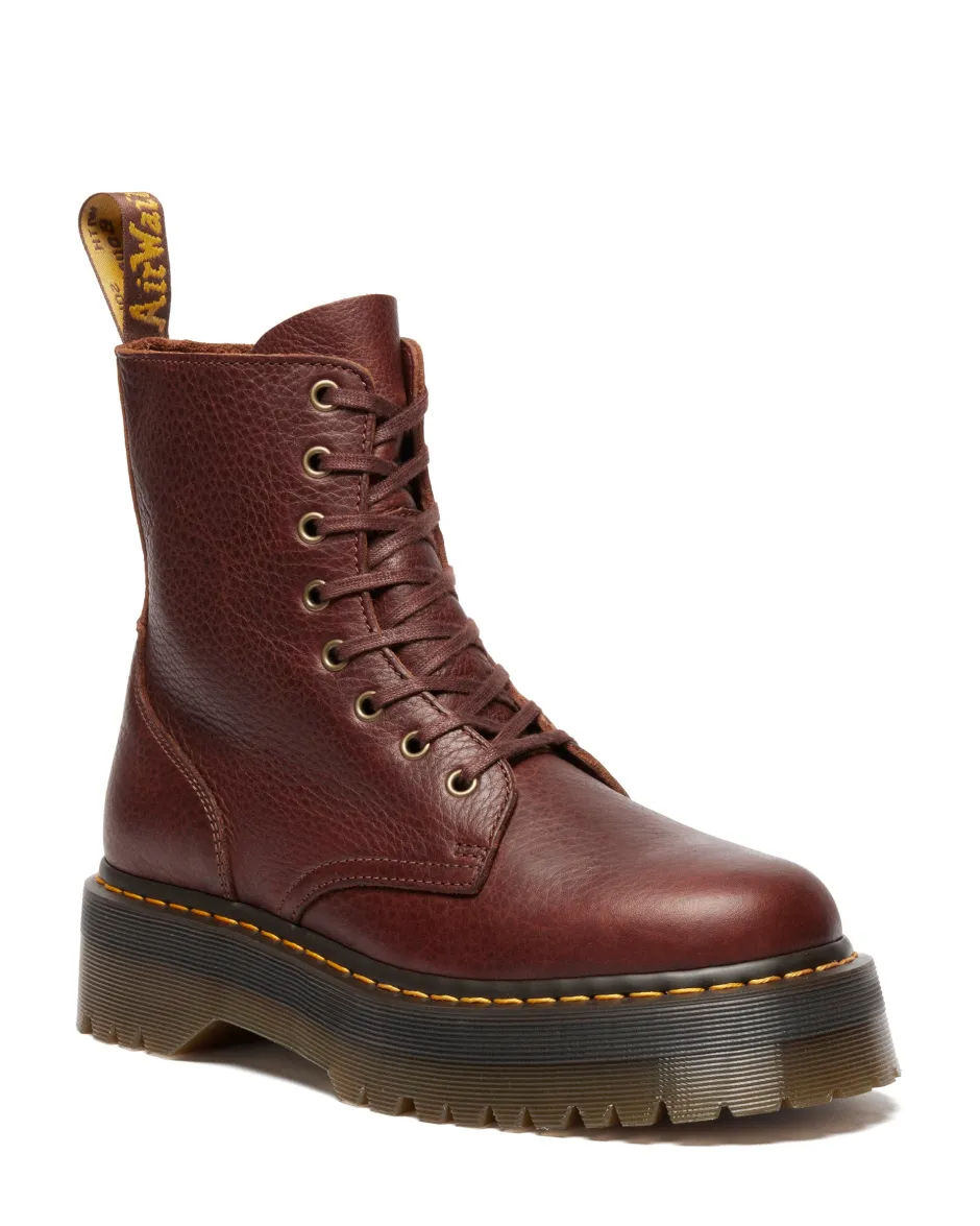 Jadon-saapas on muunneltu tummemmasta ja täyteläisemmästä nahasta. Päällystetty Ambassador-nahalla, joka on sekä painava että pehmeä. Raikas värimaailma tuo vuodenaikaan sävyä täydentävillä intialaisilla antiikkikultaisilla yksityiskohdilla ja sävytikkaus siluetissa. Täydensimme saappaan DM:n tunnusmerkeillä: kirjoitetulla kantalenkillä, keltaisilla teretikkauksilla ja läpinäkyvällä Quad-platform-pohjalla.