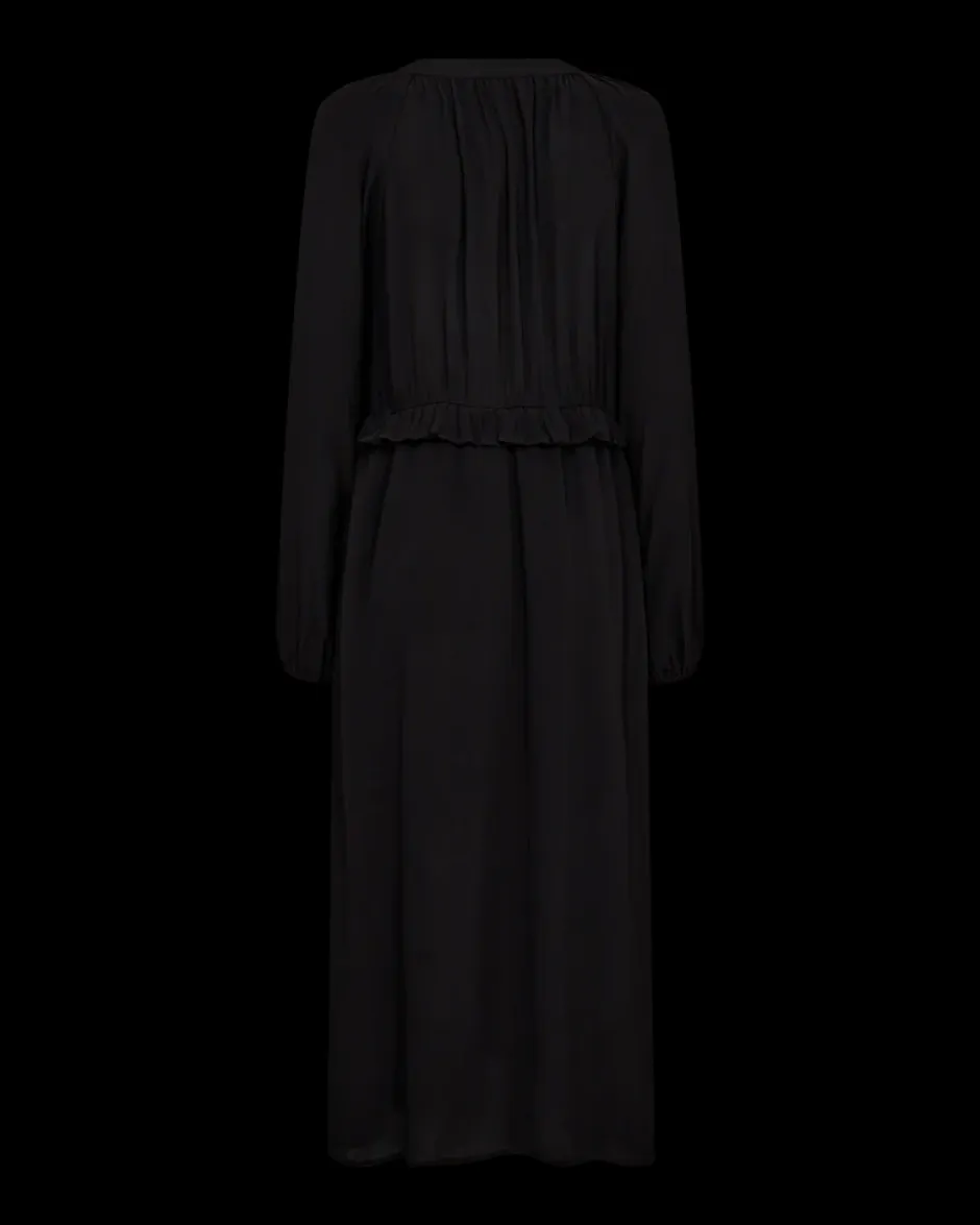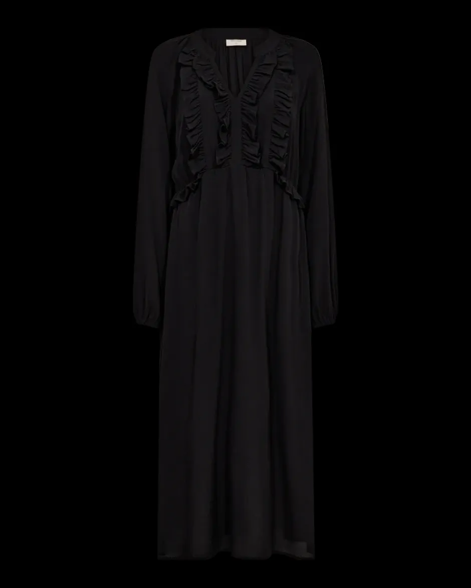 Pitkä Freequentin mekko kevyestä materiaalista kauniilla röyhelöyksityiskohdilla. Joustavat hihat ja vyötärö, sekä v-pääntie. Sivutaskut ja rento istuvuus.