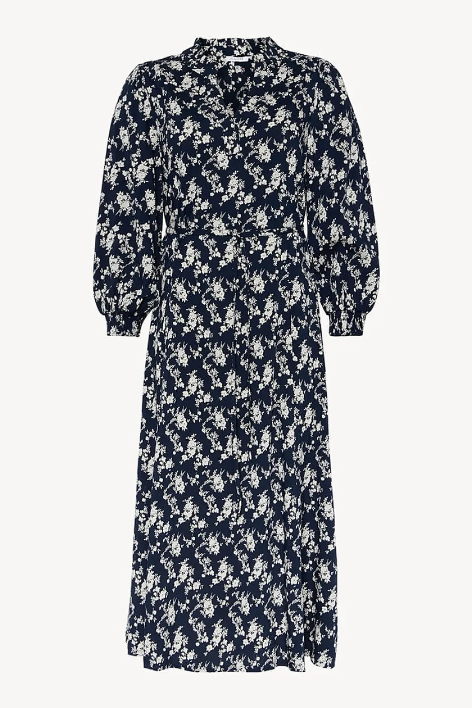Mekko kudottua viskoosia, jossa on kukkaprintti ja röyhelökaulus. Tässä mekossa on V-pääntie ja laskokset olkapäillä sekä resori smocking hihoissa. Pituus on 125 cm.