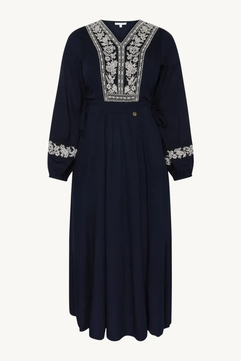Clairen pitkä V-pääntiellä varustettu mekko viskoosista, jossa on kirjailtuja yksityiskohtia. Mekossa on pussihihat joustavilla hihansuilla, säädettävät sivunauhat ja smokkirypytetty vyötärö, joka mahdollistaa mukautettavan istuvuuden.