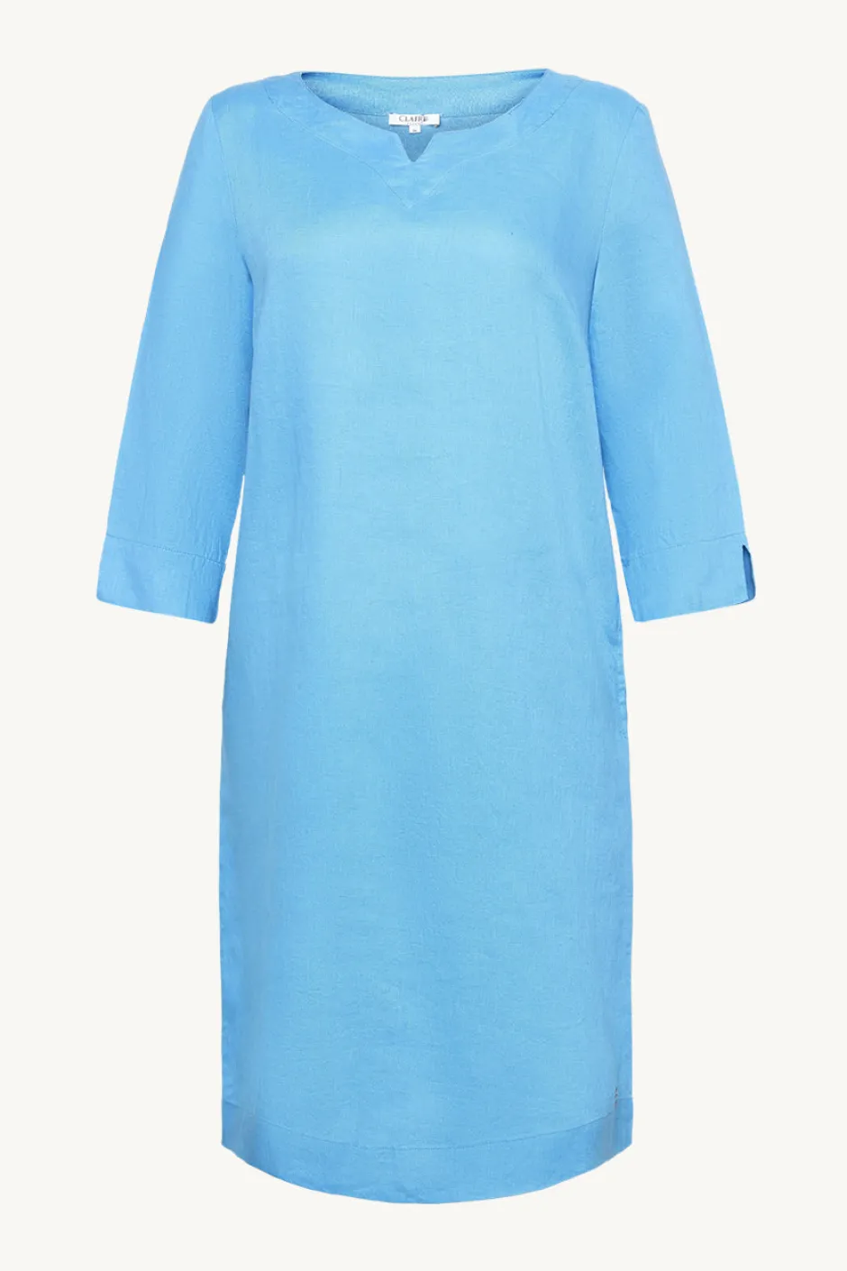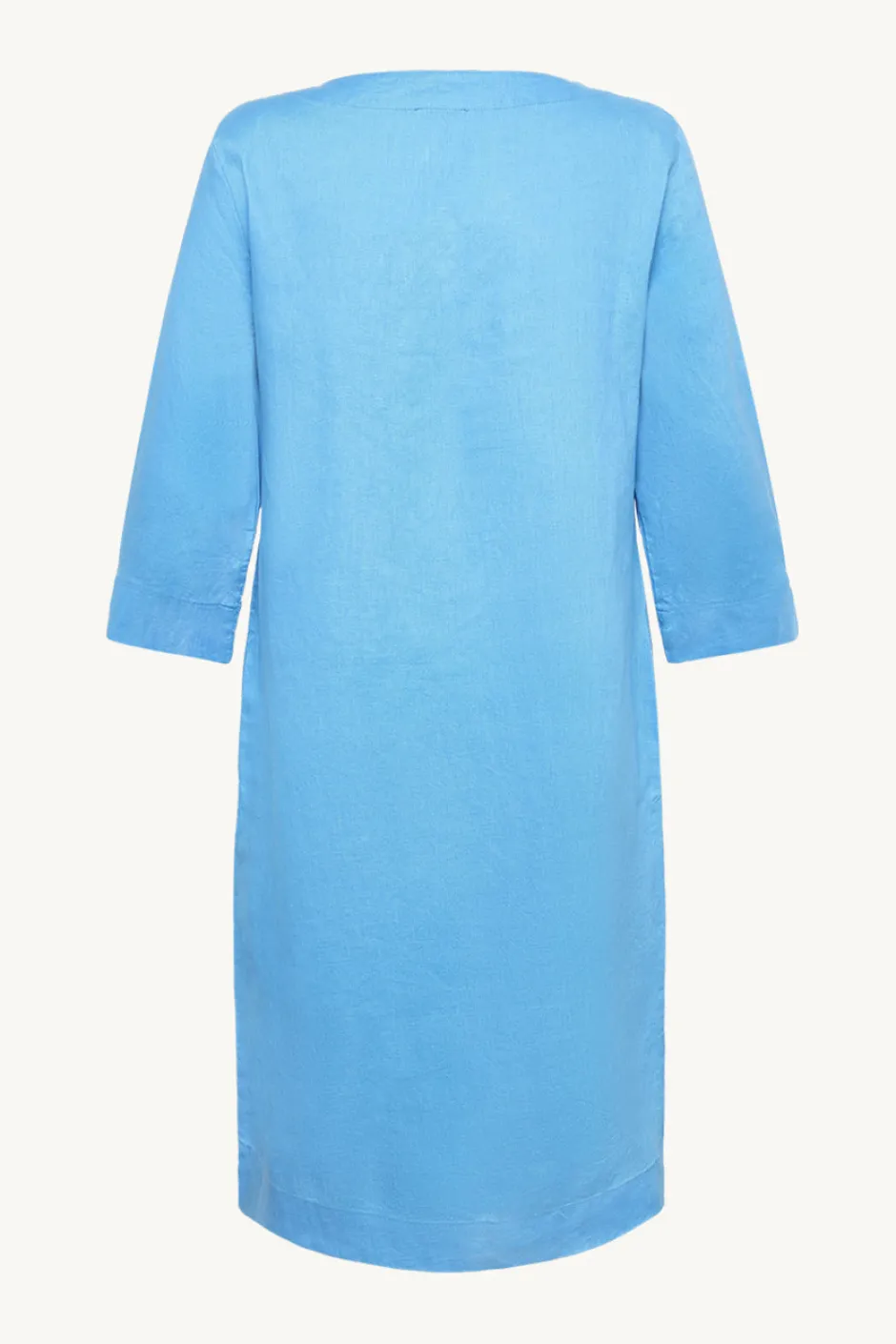 Kaunis pellavamekko v-pääntiellä. Edessä taskut ja hihoissa halkiot.