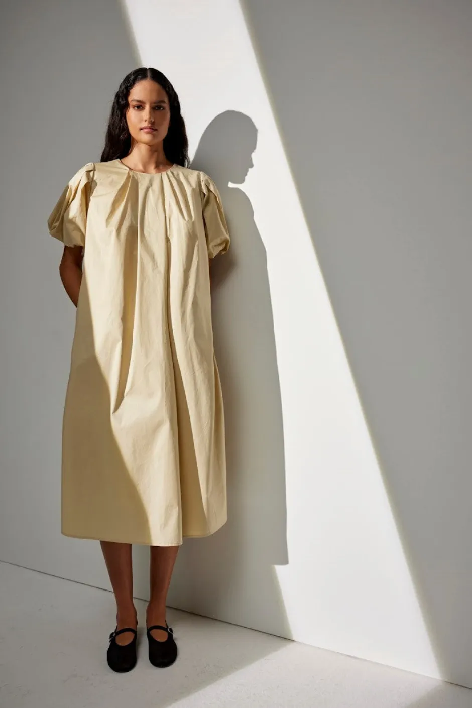 Kaunis mekko runsailla puhvihihoilla ja taskuilla. Mukana tulee kapea naru, jonka voi halutessaan sitoa vyötärölle.