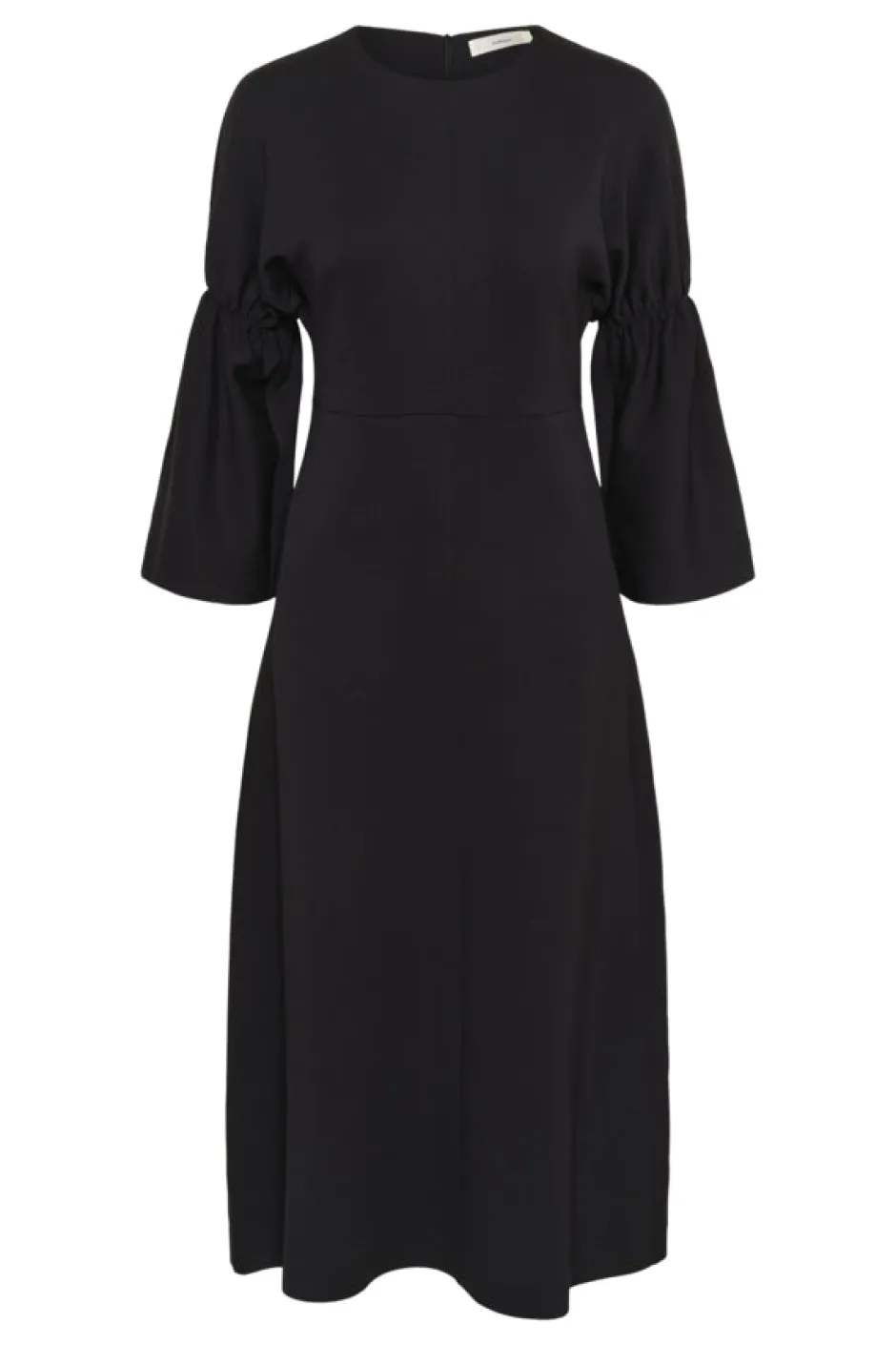 Midi-pituinen mekko, jossa on räätälöity istuvuus ja pyöreä pääntie, jota täydentävät rypytetyt kolmeneljäsosan pallohihat. Imarteleva siluetti ja mukava kangas tekevät siitä sopivan niin työ- kuin iltapukeutumiseen.