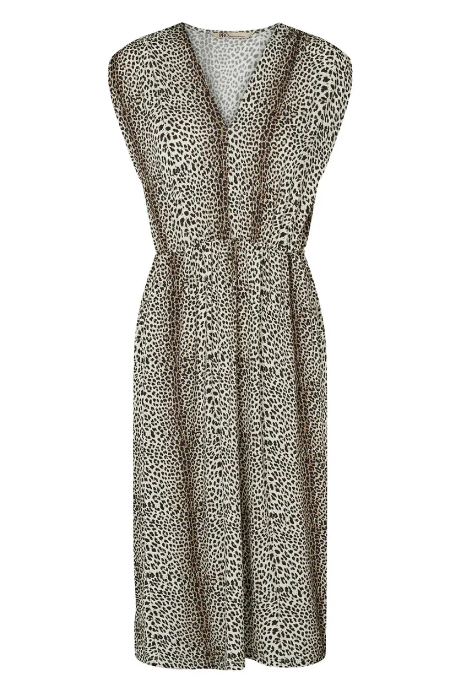 PBO:n kaunis täyspitkä mekko. Mekossa on kaunis leopardikuvio ja v-pääntie. Vyötäröllä ja olkasaumassa on rypytykset ja molemmilla sivuilla taskut. Kangas on paksua viskoosia ja joustaa.