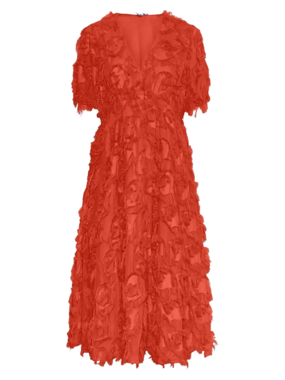 Naisten kaunis midimekko upeilla 3D-höyhendetailjeilla. Hameesta löytyy vuorikangas ja kerros tylliä tuomaan voimakkaamman A-linjan helmaan. Loistava valinta kesän tulevia juhlia varten!