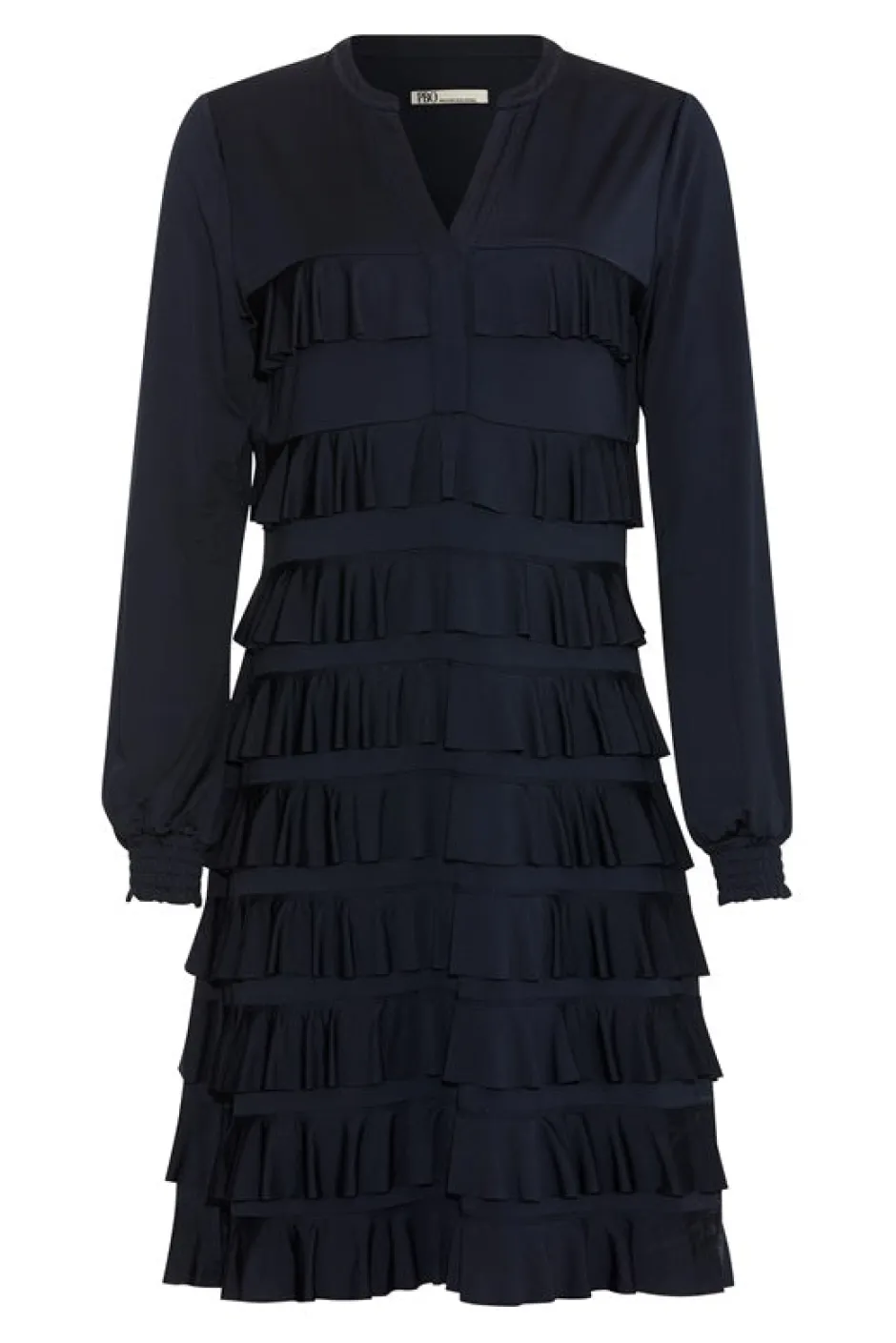 PBO:n upeassa röyhelömekossa on lyhyt helma ja pitkät hihat. Mekossa on v-pääntie, kapea istuvuus ja hihansuissa joustavat kuminauhat. Materiaali on joustavaa ja miellyttävän tuntuista modaali-sekoitetta.