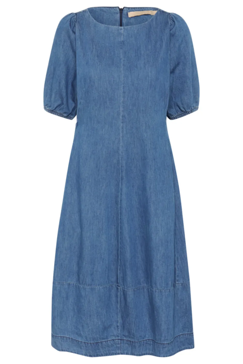 Midi mittainen denim mekko, jossa on joustavat hihansuut, jotka luovat kauniin pallomaisen vaikutelman. Mekossa on hienovaraiset saumat sivulla ja takana, mikä korostaa imartelevaa ja naisellista siluettia.