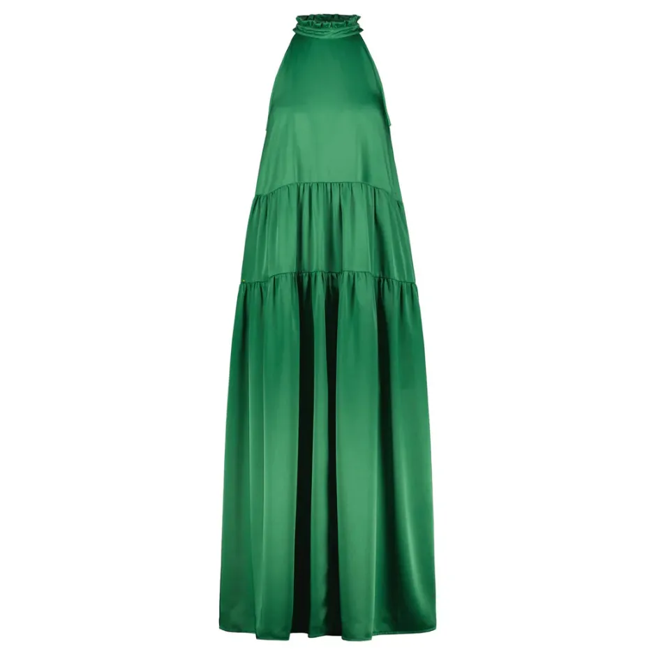 SARAH-mekko leijuu helposti ja hienostuneesti. Mekossa on upea vihreä kiilto ja se laskeutuu kauniisti vartalolle. Korkea pääntie ja röyhelöyksityiskohdat.
