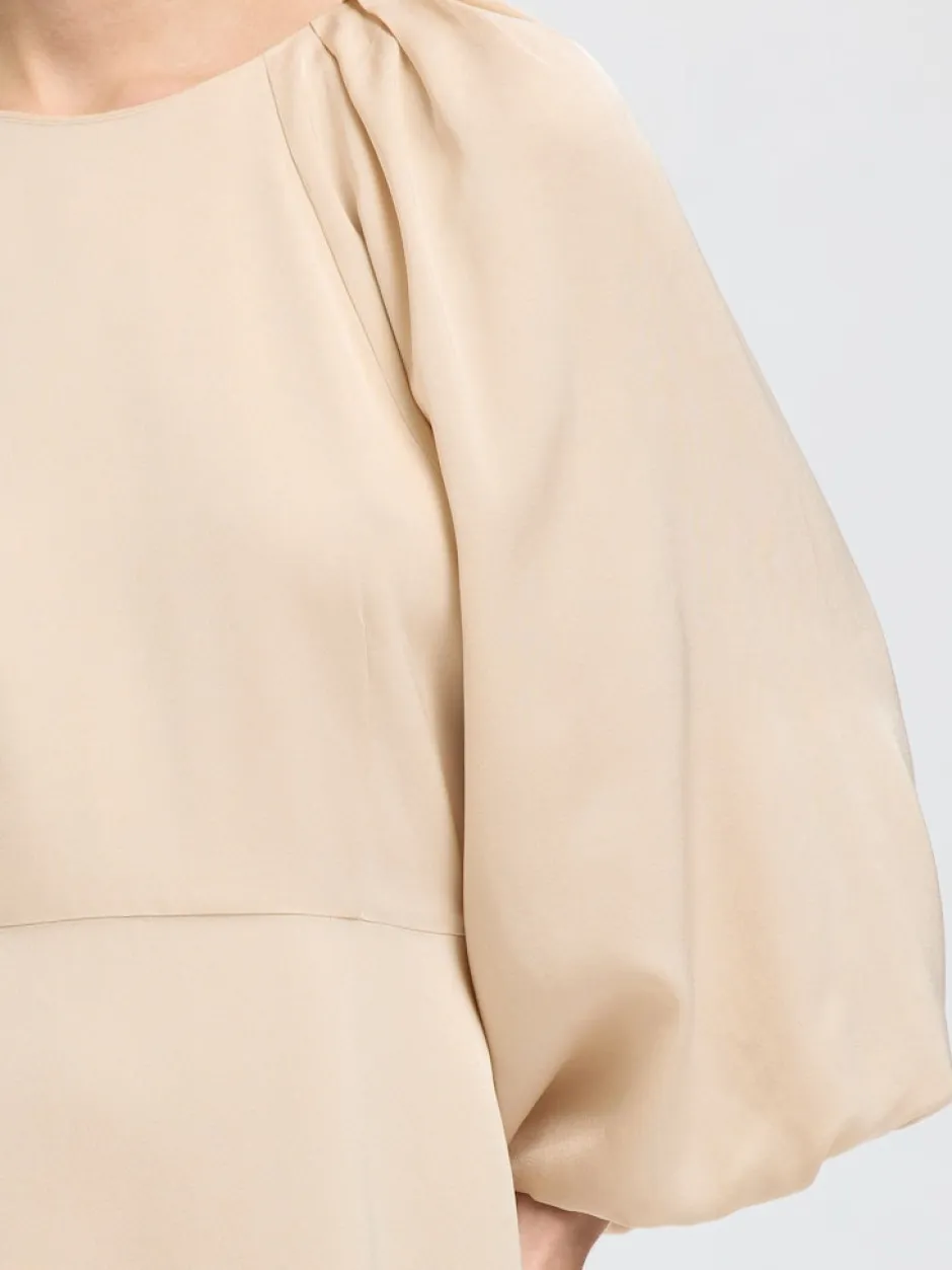 Tämä tyylikäs mekko yhdistää modernin ja klassisen ilmeen, ja se on täydellinen valinta niin arkeen kuin juhlahetkiin. Mekossa on pyöreä kaulus ja 3/4-pituiset, puffihihat, jotka tuovat ilmeeseen eleganttia volyymia.