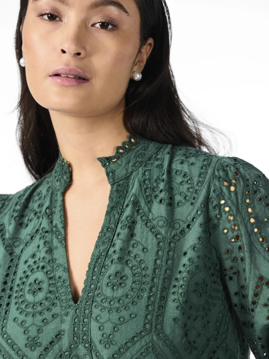 Röyhelöreunainen kiinalaiskaulus, v-pääntie, pallohihat. Hihansuissa röyhelöreunaiset kalvosimet. Kerrostettu helma, jossa brodeerattu siksakmuoto. Mekossa on vuori. Rento istuvuus.