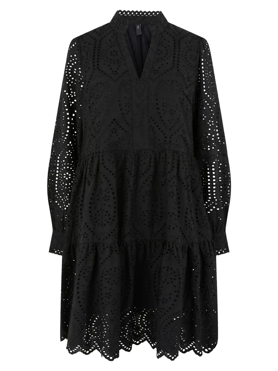 Röyhelöreunainen kiinalaiskaulus, v-pääntie, pallohihat. Hihansuissa röyhelöreunaiset kalvosimet. Kerrostettu helma, jossa brodeerattu siksakmuoto. Mekossa on vuori. Rento istuvuus.