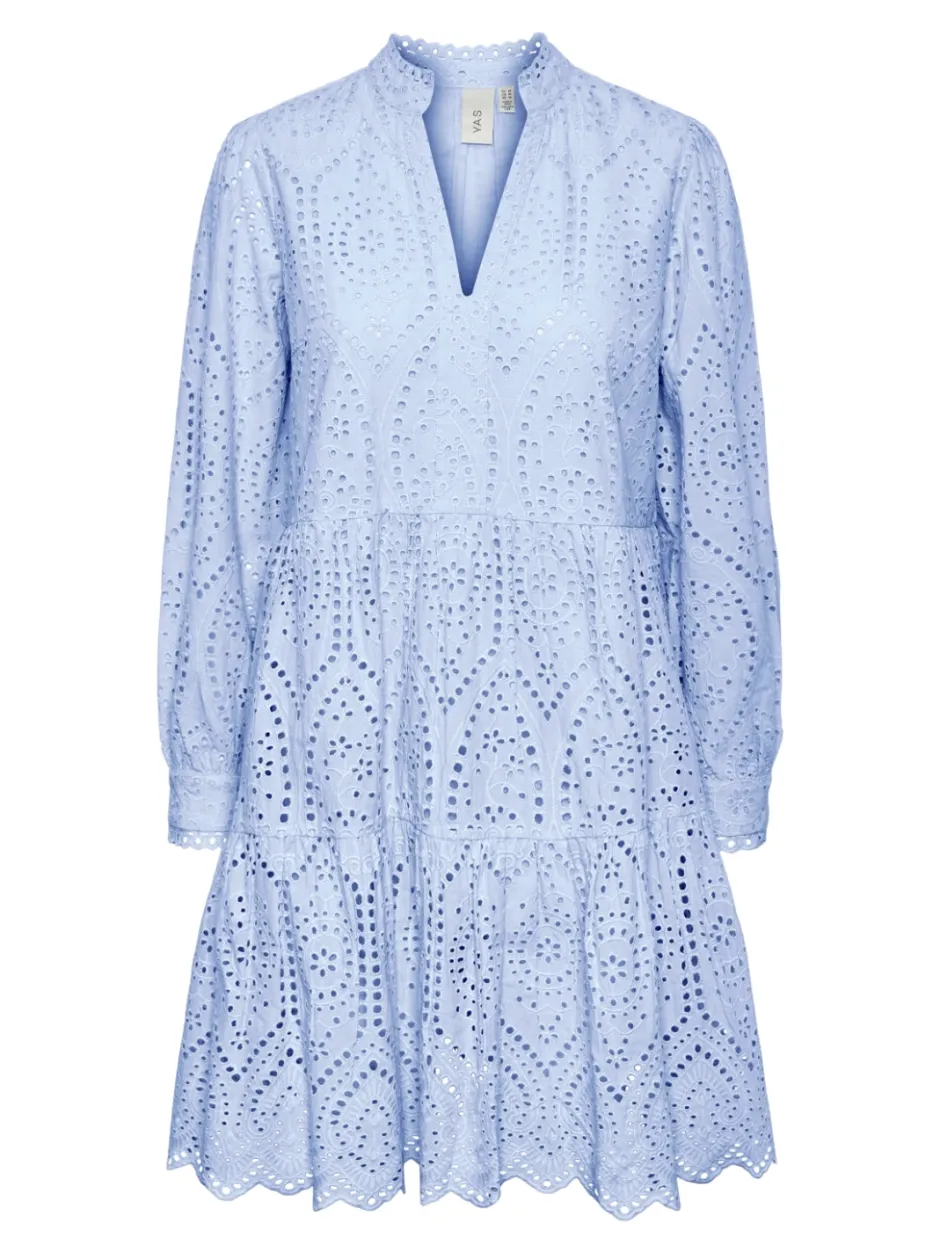 Röyhelöreunainen kiinalaiskaulus, v-pääntie, pallohihat. Hihansuissa röyhelöreunaiset kalvosimet. Kerrostettu helma, jossa brodeerattu siksakmuoto. Mekossa on vuori. Rento istuvuus.