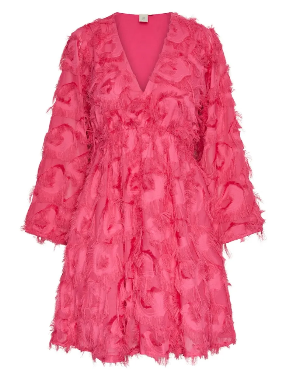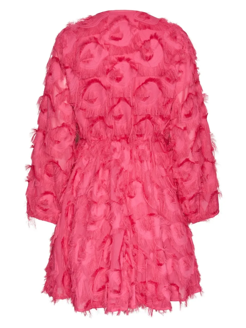 – Teksturoitu minimekko – V-kaula-aukko – Pitkät hihat – Empire-vyötärö – A-linjainen hameosa – Mallilla on yllään koko M