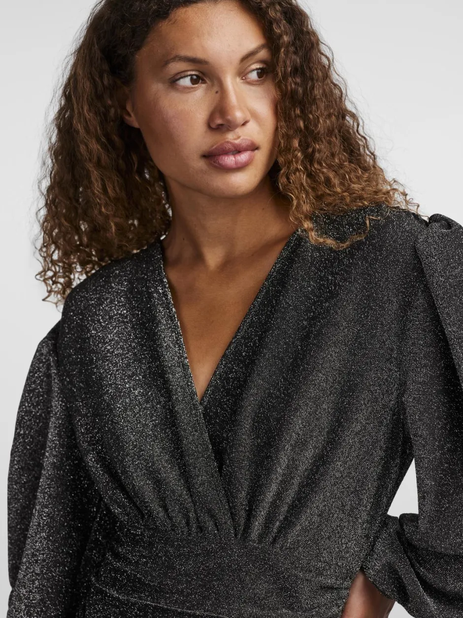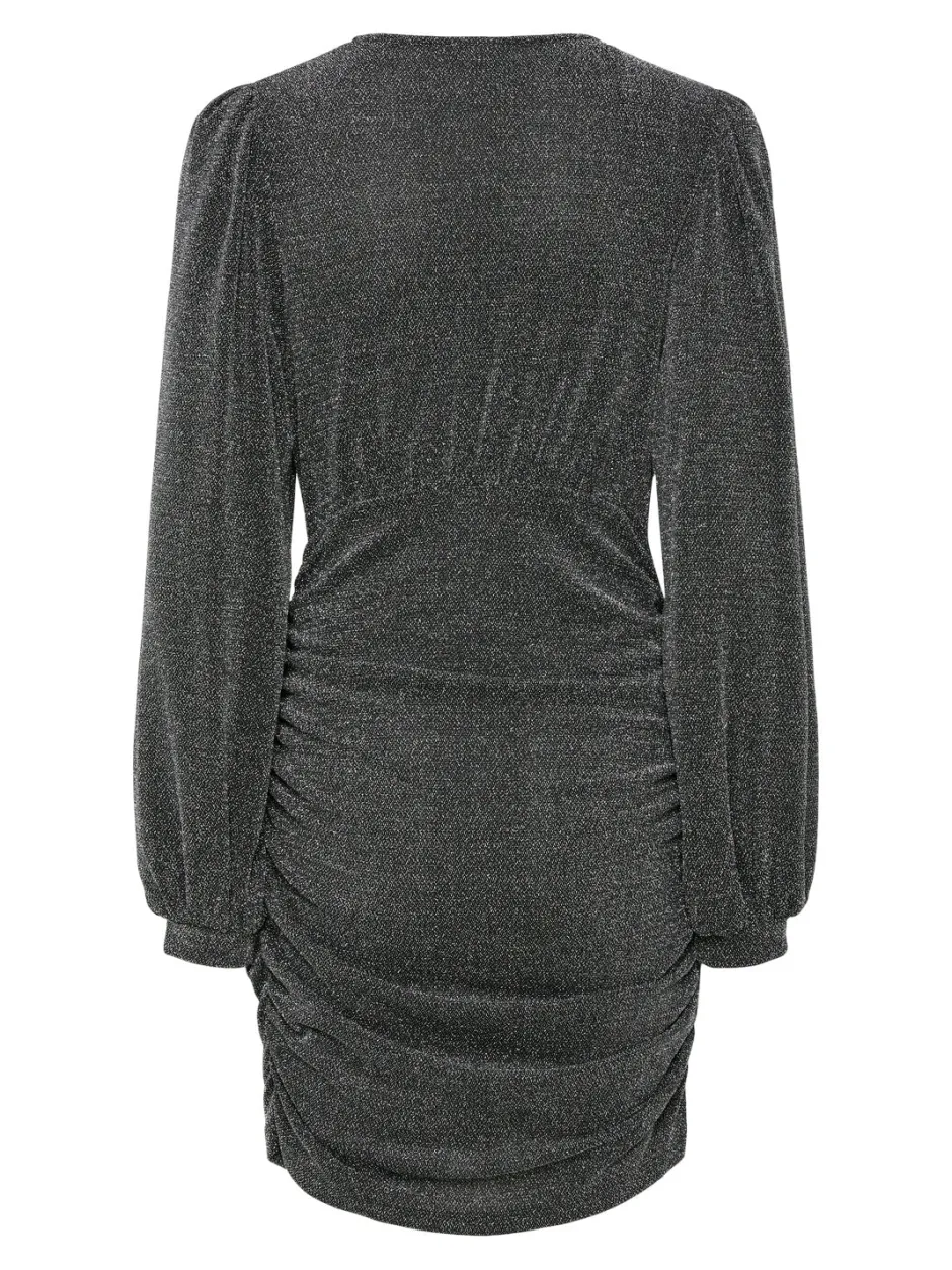 Y.A.Ssin glittermekko pitkillä pallohihoilla ja v-aukolla. Rypytys sivuilla.