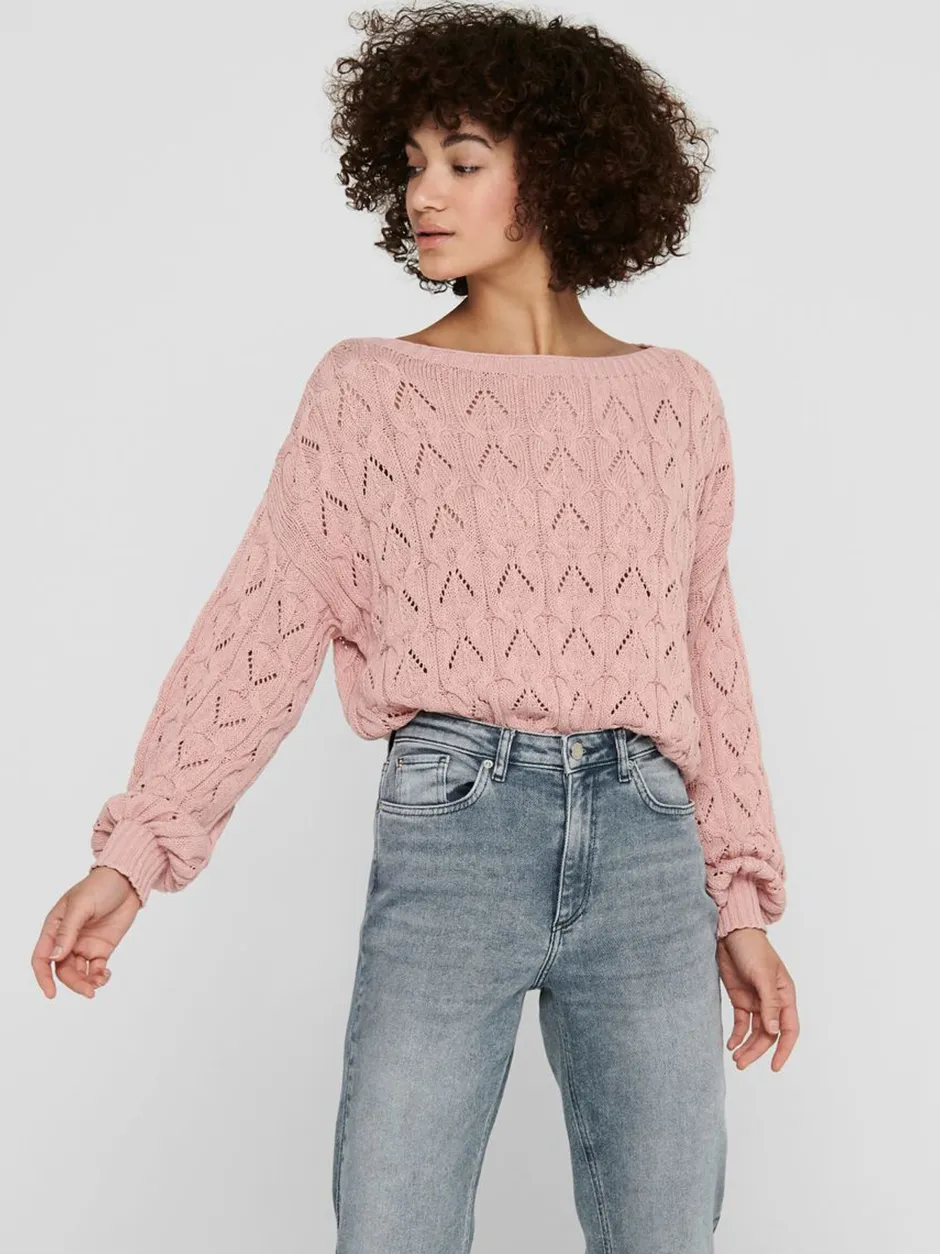 Onlyn puuvillainen neulepaita, jossa on kaunis kuvioitu pinta. Avara pääntie ja joustavat ribbneulotut resorit hihansuissa ja helmassa.
