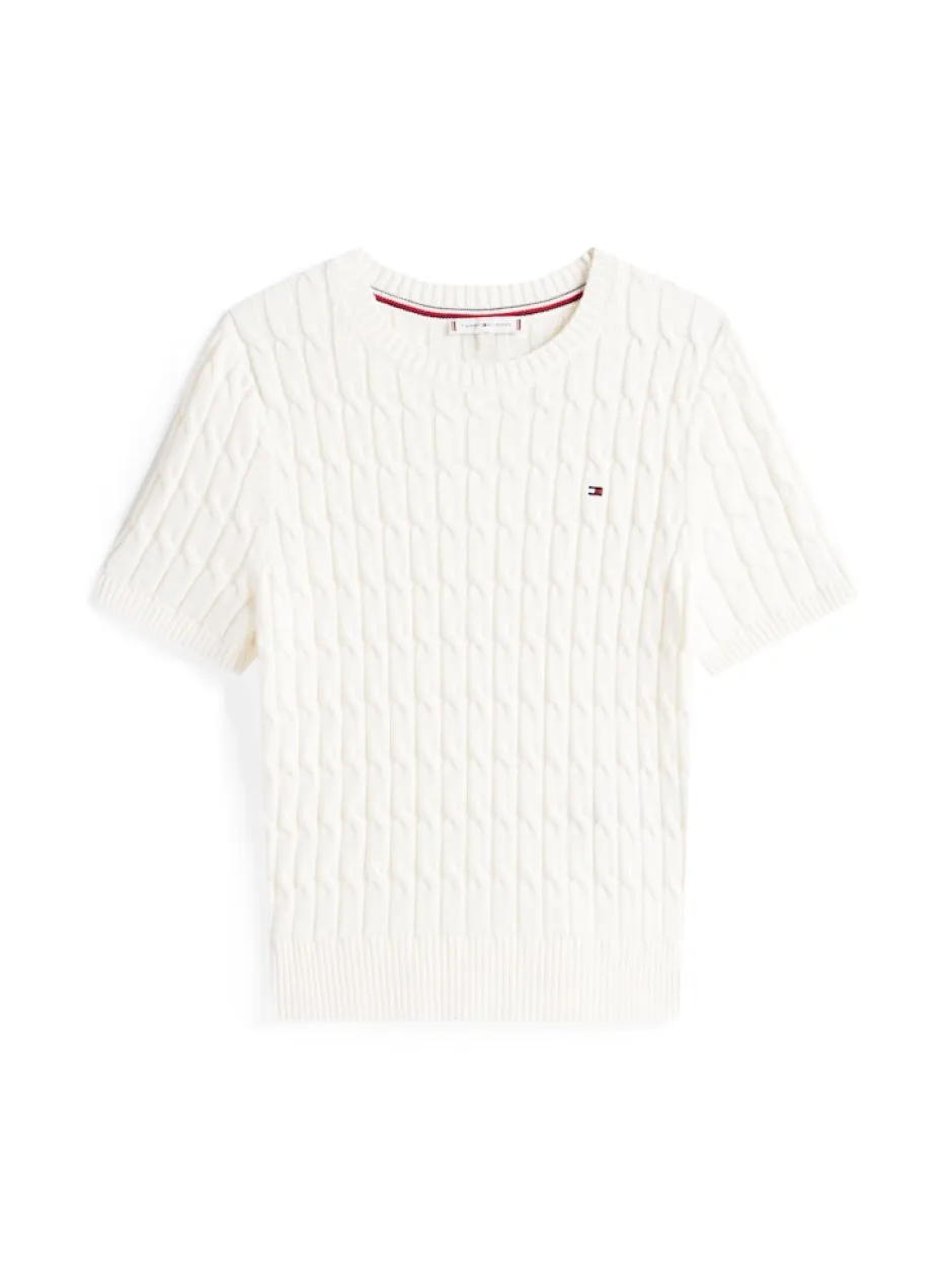 Tässä puuvillasta valmistetussa palmikkopuserossa on tyylikäs lyhythihainen siluetti.