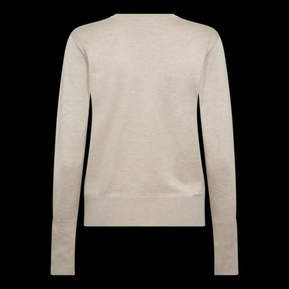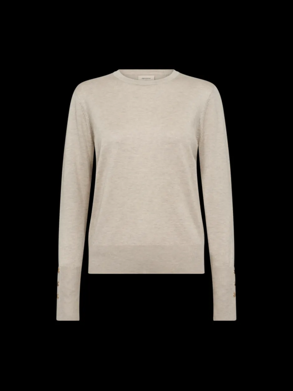 Neulepusero pehmeästä, hienoksi neulotusta materiaalista. Neulepuserossa on yksinkertainen siluetti rennolla istuvuudella, pyöreä kaula-aukko, resorit sekä pitkät hihat koristelluilla napilla..
