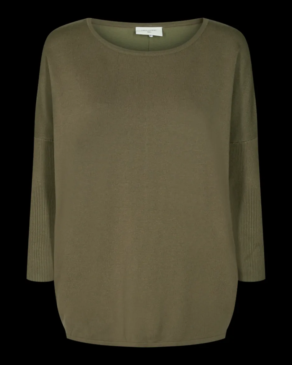 Freequentin yksivärinen neulepusero vajaamittaisilla ribneuloshihoilla. O-pääntie, malliltaan kapenee helmaan. Koossa S pituus n.65 cm.
