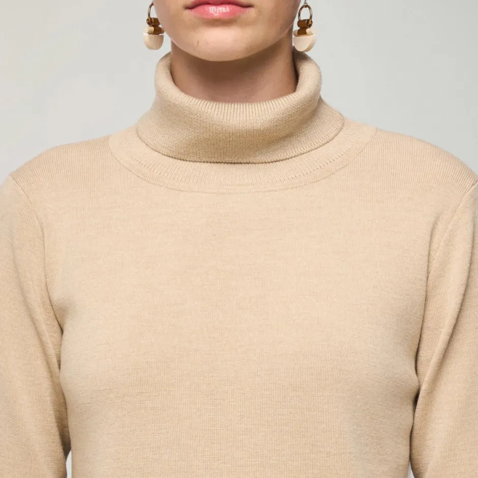 Ajaton ja helppokäyttöinen Nomi-pooloneule on, kestävä ja helppohoitoinen klassikko. Neuleessa yhdistyy kauniisti hieman A-linjainen malli, istuva yläosa, korkea poolokaulus, helman halkiot sekä pitkät hihat. Nomi-neule on tyylikäs luottovaate, jonka Aarikan puunappi viimeistelee kauniisti.