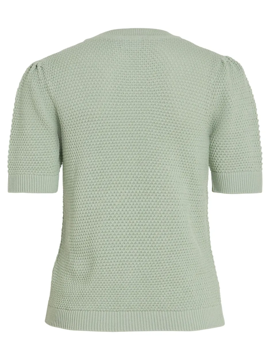 – Lyhythihainen neuletoppi – Resori helmassa – Pyöreä pääntie – Joustavaa neulosta – Pituus: 58 cm koossa M – Hihan pituus: 26 cm koossa M – Malli on 178 cm pitkä, yllä M-koko.
