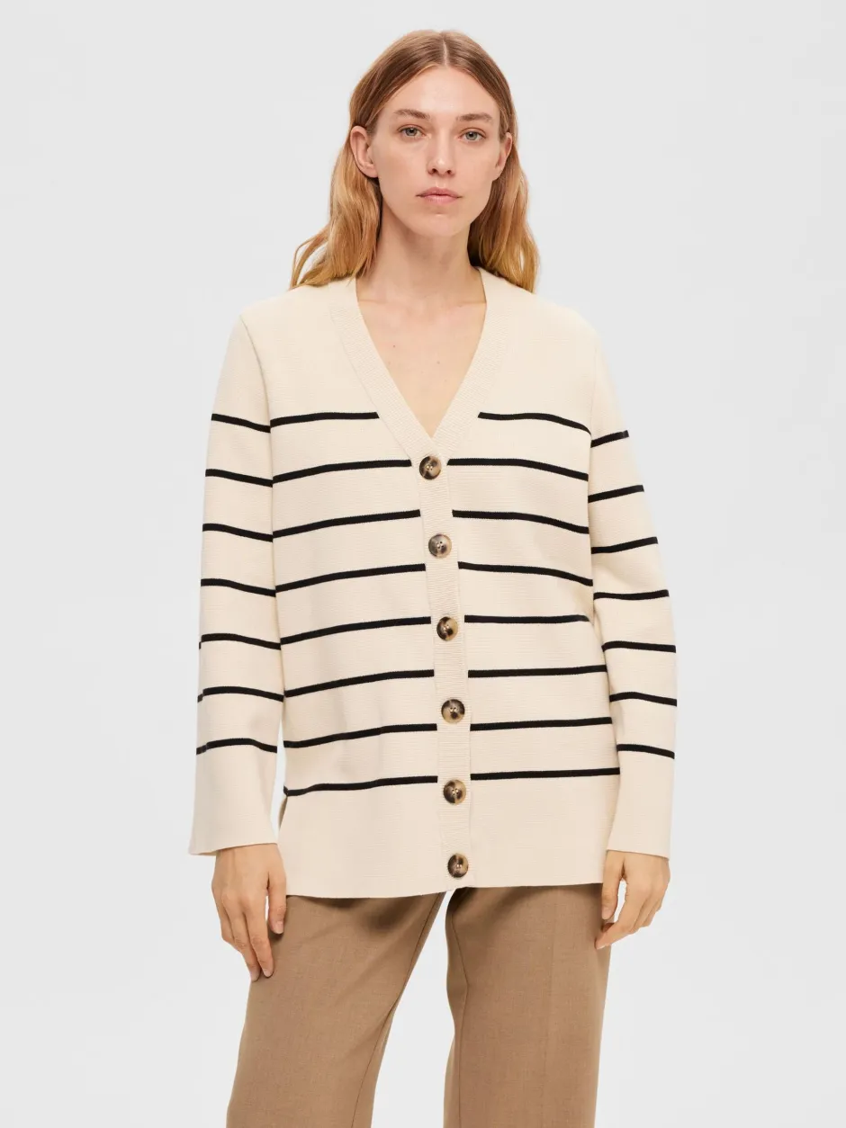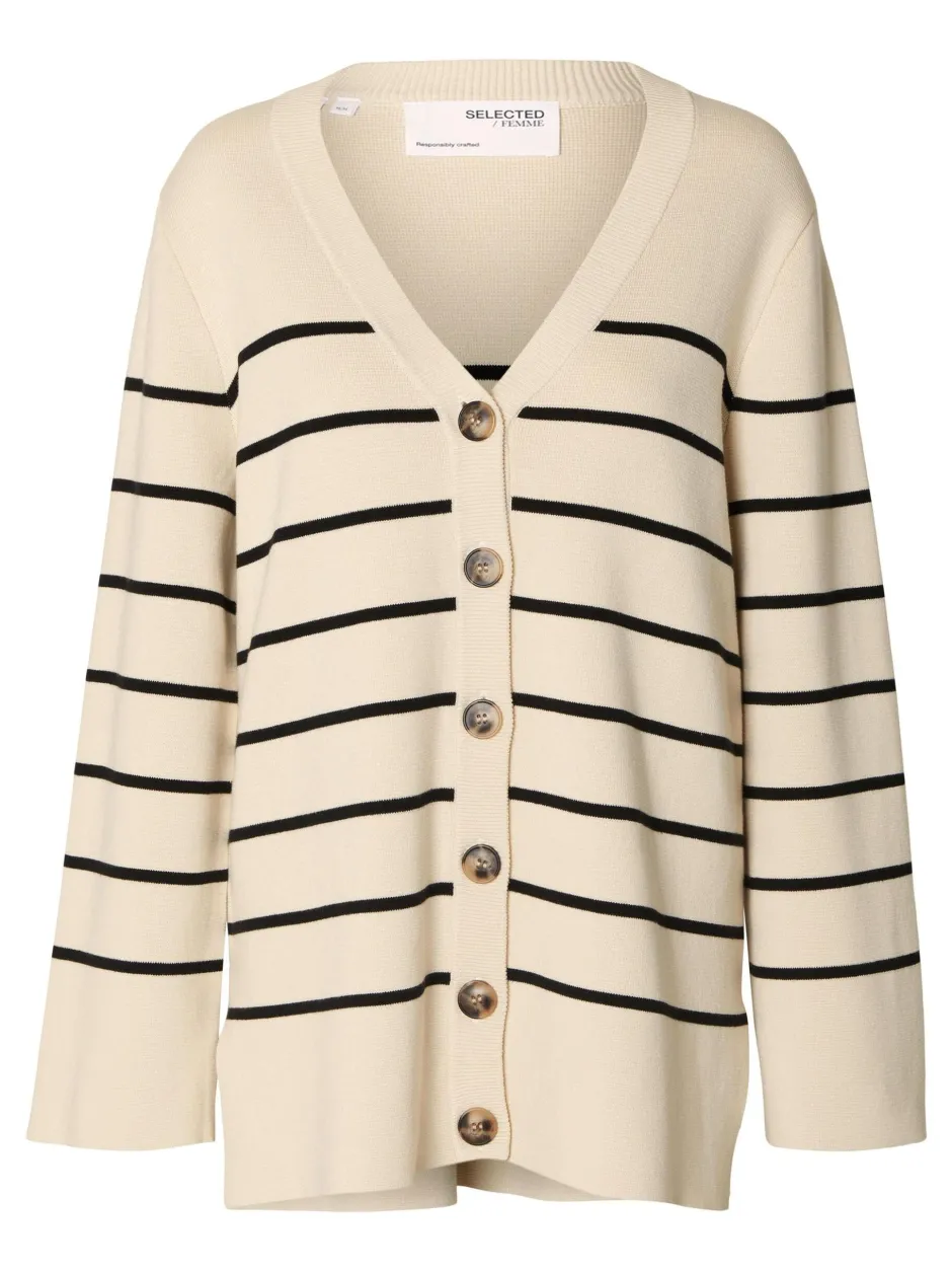 Luomupuuvillasta valmistetussa neuletakissa on näyttävän kokoiset napit ja lasketut olkapäät.