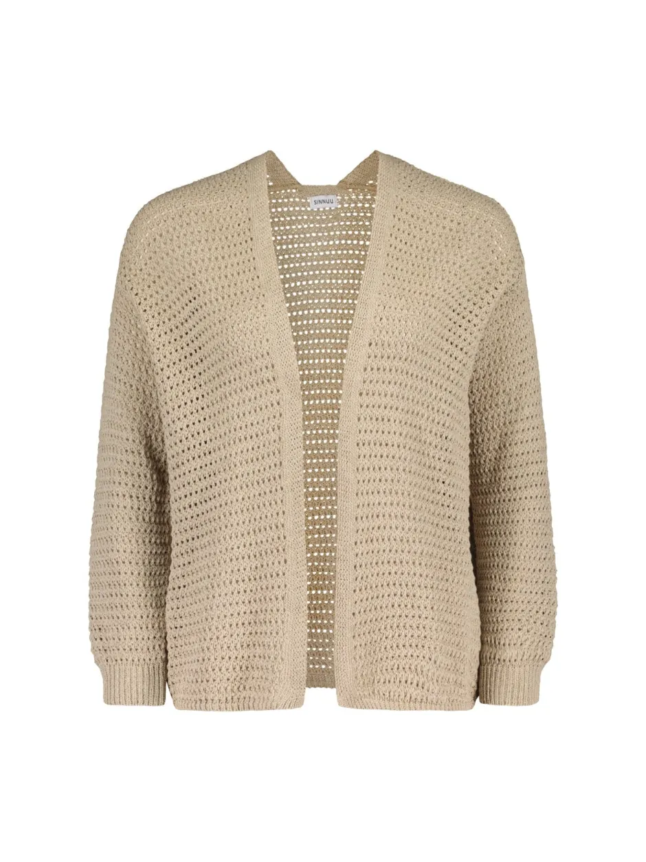 Kotimaisen Sinnuun LOREN-neuletakki on helppo ja monikäyttöinen vaate ympärivuotiseen käyttöön. Neuletakissa on edestä avoin, napiton malli ja pitkät hihat, joissa hihansuussa joustavaa neulosta. Neuletakissa on pitsimäinen, reikäinen kuviointi, joka tekee siitä hieman läpinäkyvän sekä erityisen hengittävän. Tämän lisäksi neuletakin materiaali on korkealaatuista puuvillaa, joka on miellyttävä materiaali jokaisena vuodenaikana kesästä talveen.