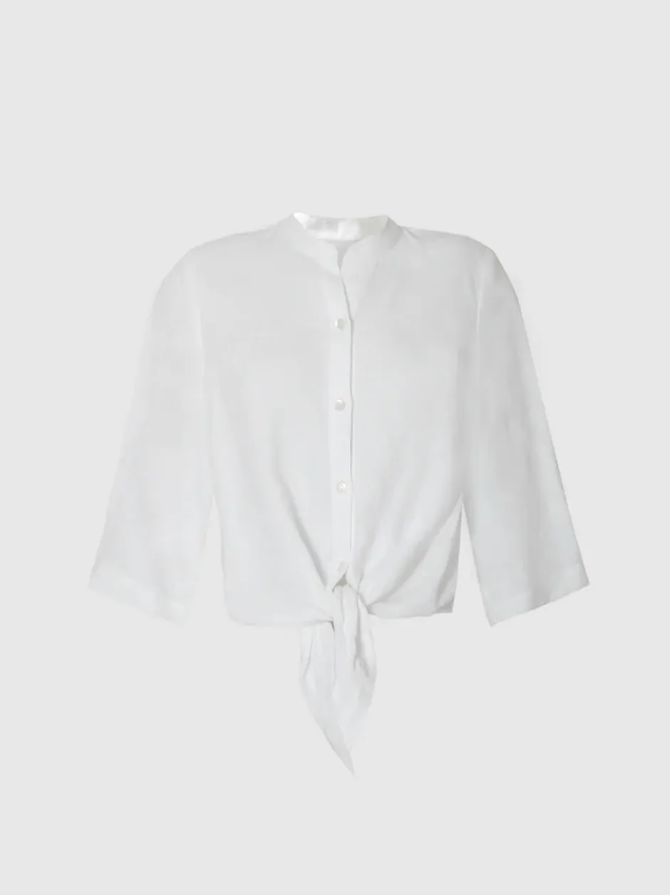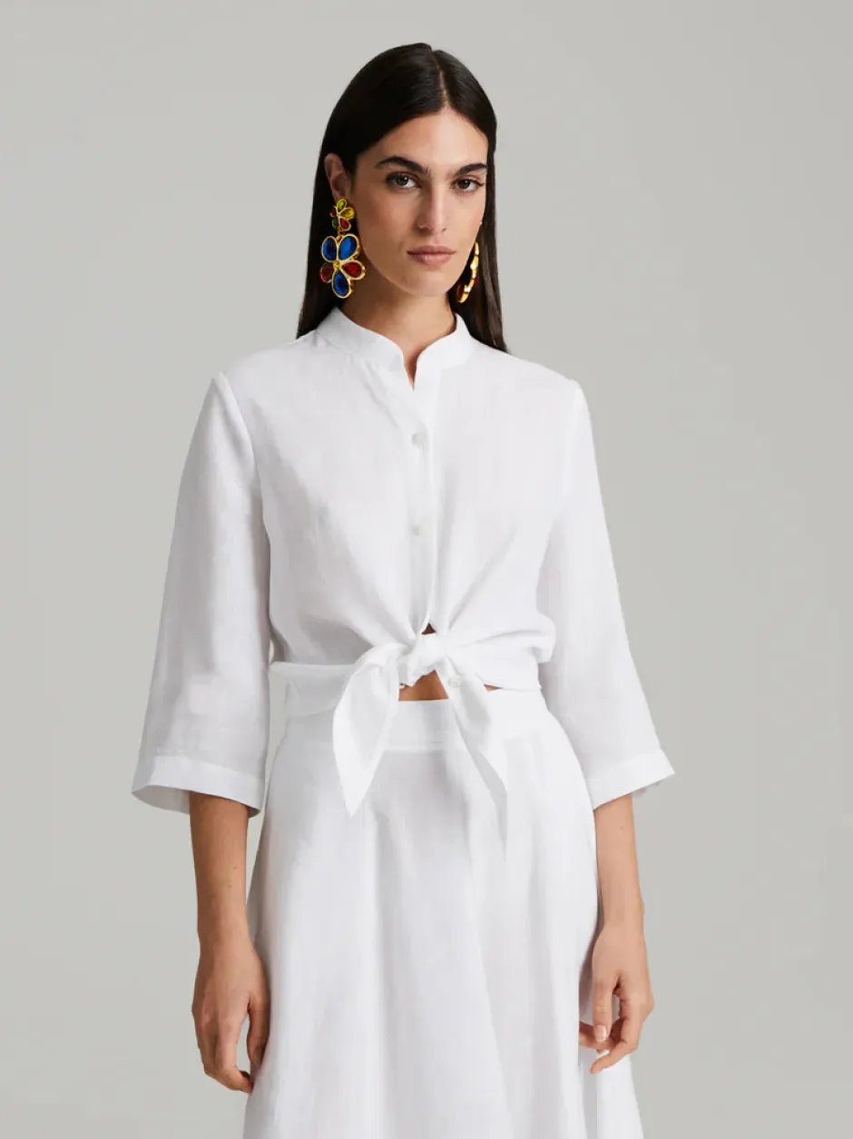 Vyötärölle solmittava pellavapaita italialaisesta pellavasta, jossa on rento istuvuus, vajaamittaiset hihat ja kaulukset.