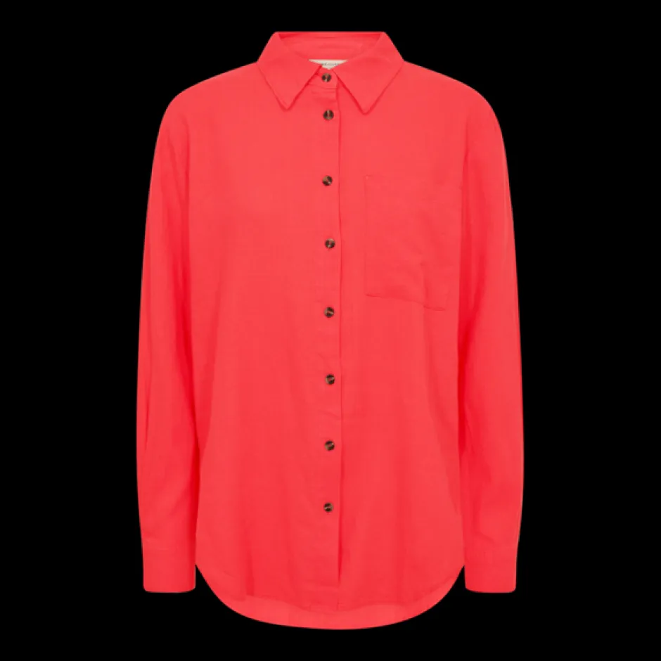 Viileän tuntuinen ja hengittävä pitkähihainen naisten kangaspaita. Paitakaulus, edessä napitus ja hihansuissa napilliset kalvosimet. Yksi rintatasku. Sivuilla helmassa halkiot. Takana kaarrokkeen reunassa vastalaskos väljyysvarana. Kutistuu mahdollisesti 5% pesussa.