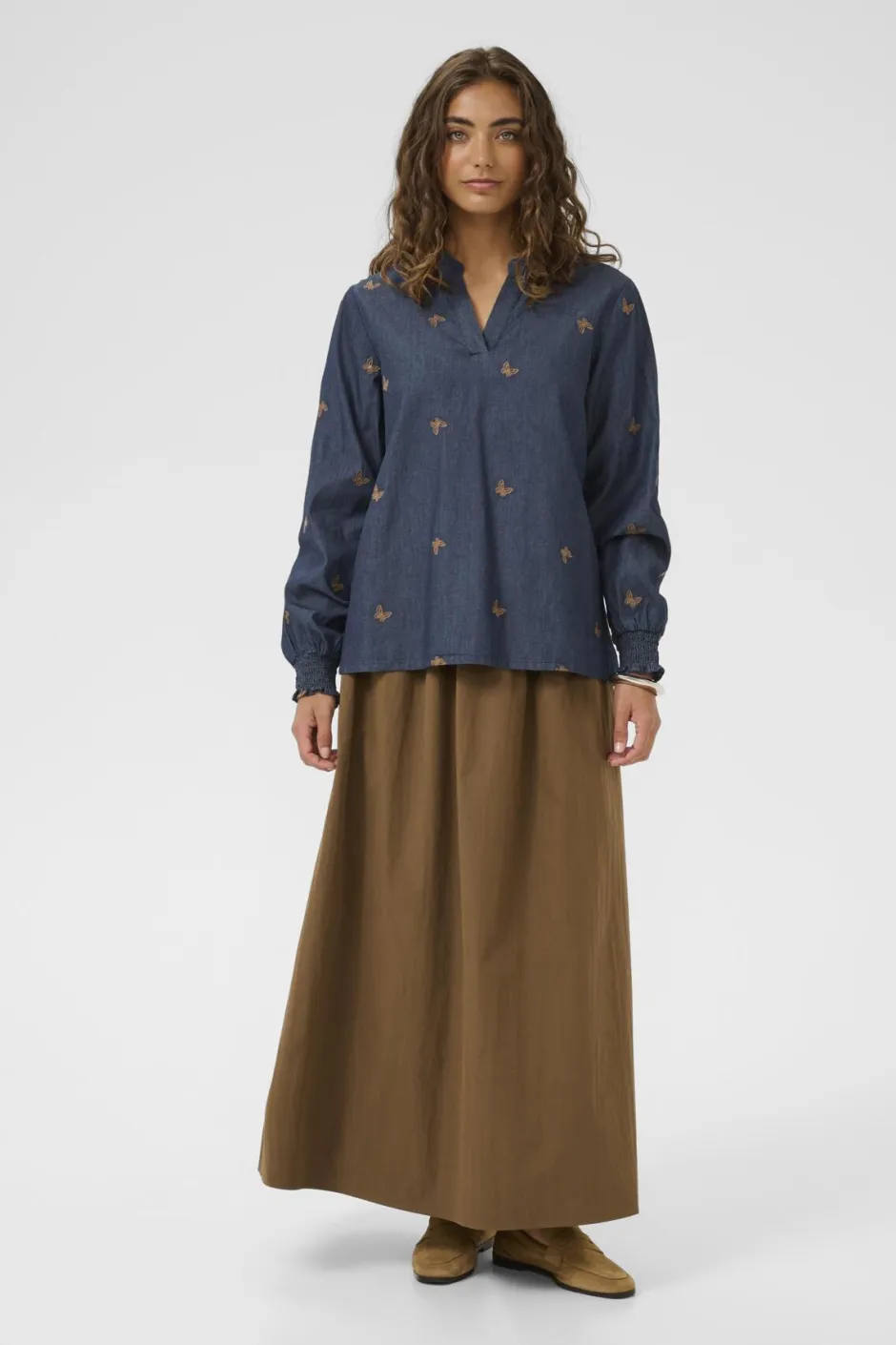 Culture Filipa Michelle Blouse on tyylikäs ja klassinen naisten pitkähihainen pusero, jossa yhdistyvät ajaton muotoilu ja laadukas denim-materiaali. Hillitty V-pääntie ja pitkät hihat antavat puserolle mukavan ja monikäyttöisen siluetin, joka sopii niin arkeen kuin hieman juhlavampaankin asuun. Lisäksi huolitellut kirjailu- ja borduuridetaljit tuovat puseroon hienovaraisesti persoonallisuutta ja lisäävät visuaalista kiinnostavuutta. Materiaali on hengittävää ja kestäväksi kudottua puuvilladenimiä, joka tuntuu miellyttävältä päällä ja sopii helposti yhteen farkkujen, hameiden tai bleiserin kanssa.