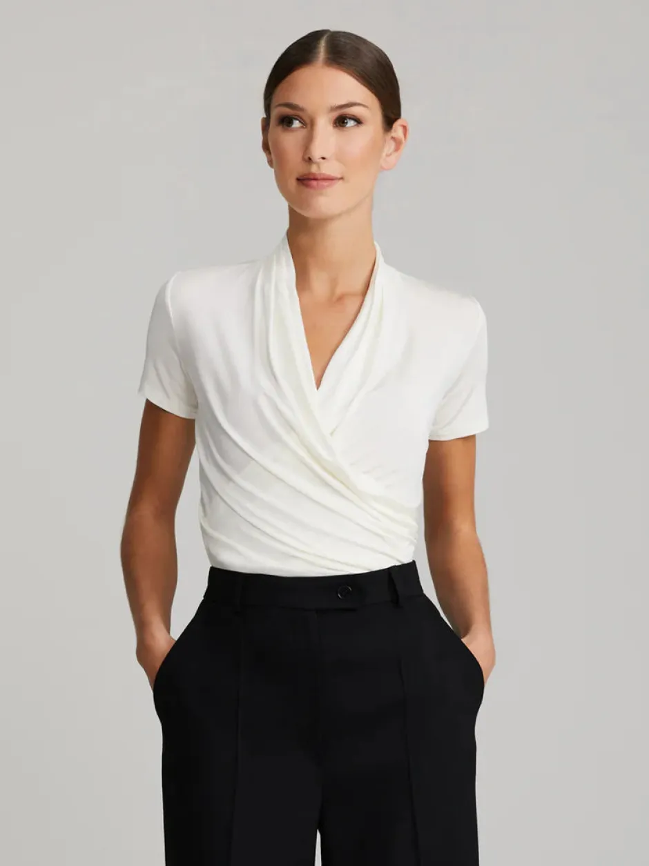 Andiatan lyhythihainen pusero joustavaa ja napakkaa trikoota. Kankaat limitetty edessä, avara pääntie. Koossa S pituus n.55 cm.