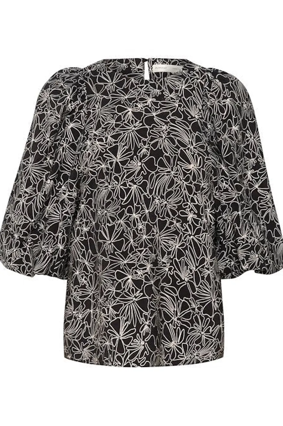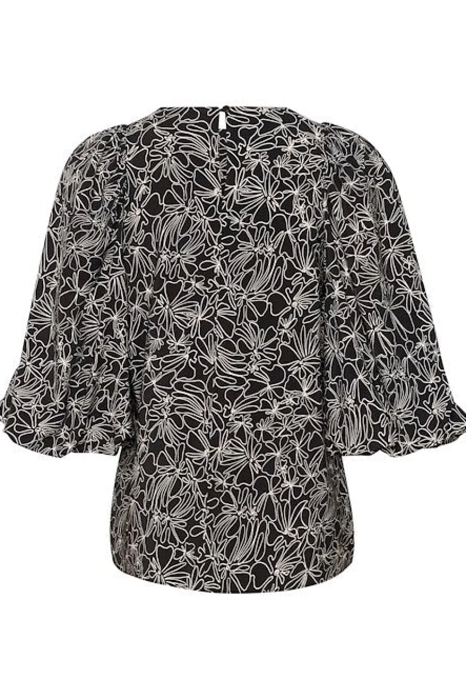 Naisten kaunis pusero puhvihihoilla, pyöreällä kaula-aukolla ja kauniilla kuvioinnilla. Normaali istuvuus. Niskassa napillinen kiinnitys.